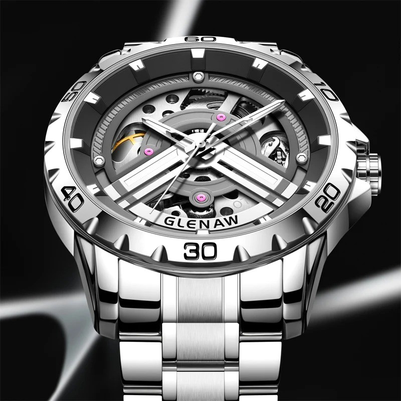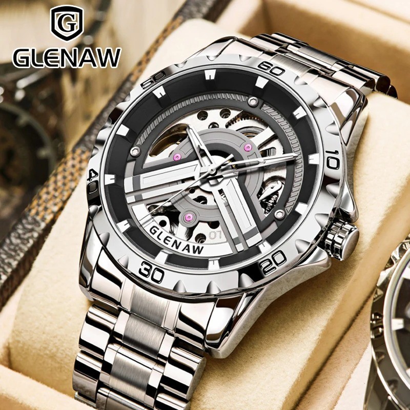 43MM GLENAW Automatic Men Watch Luxury Skeleton Waterproof Stainless Steel NEW