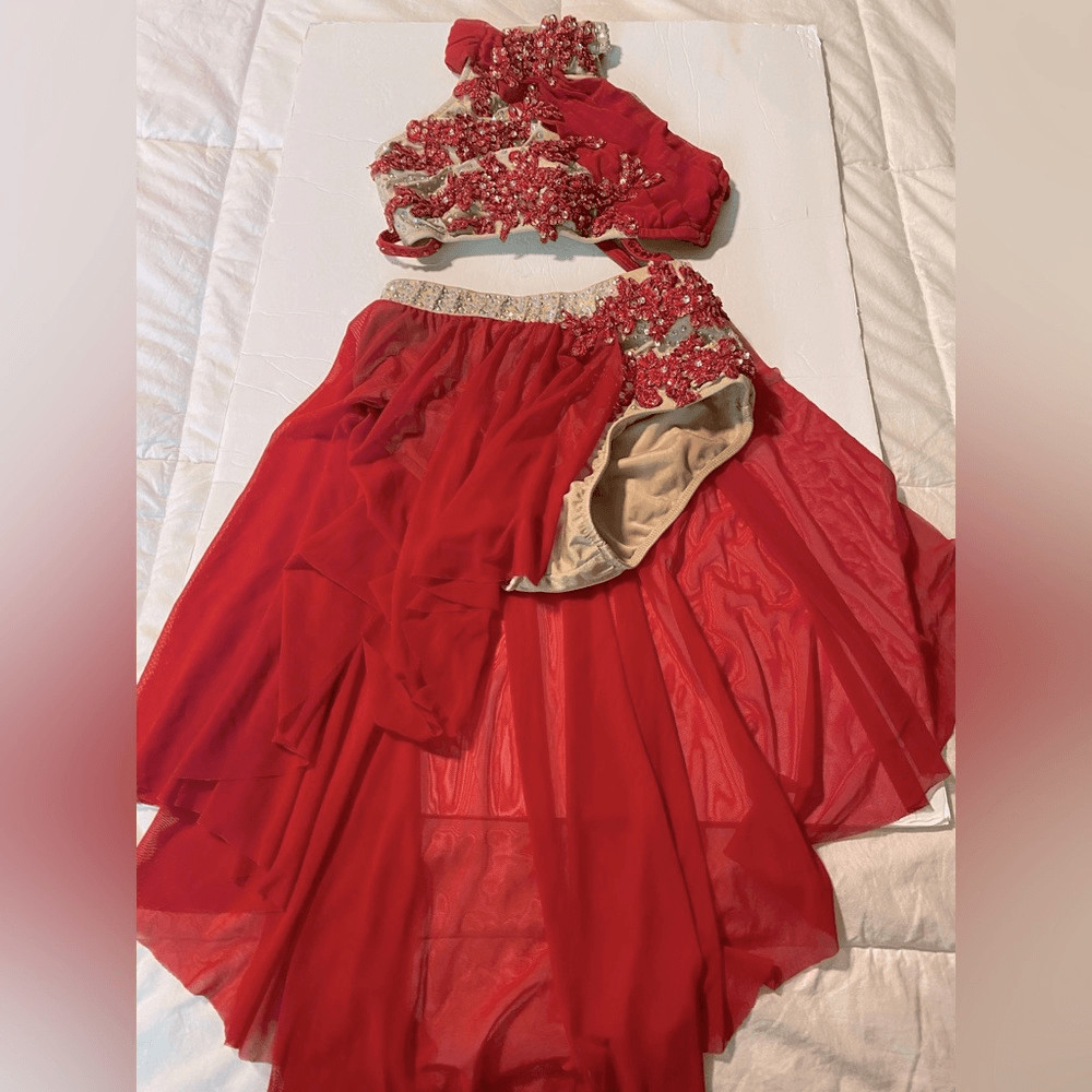 как выглядит Glamour solo dance costume 2 piece red gold lyrical rhinestone SA-Small adult фото