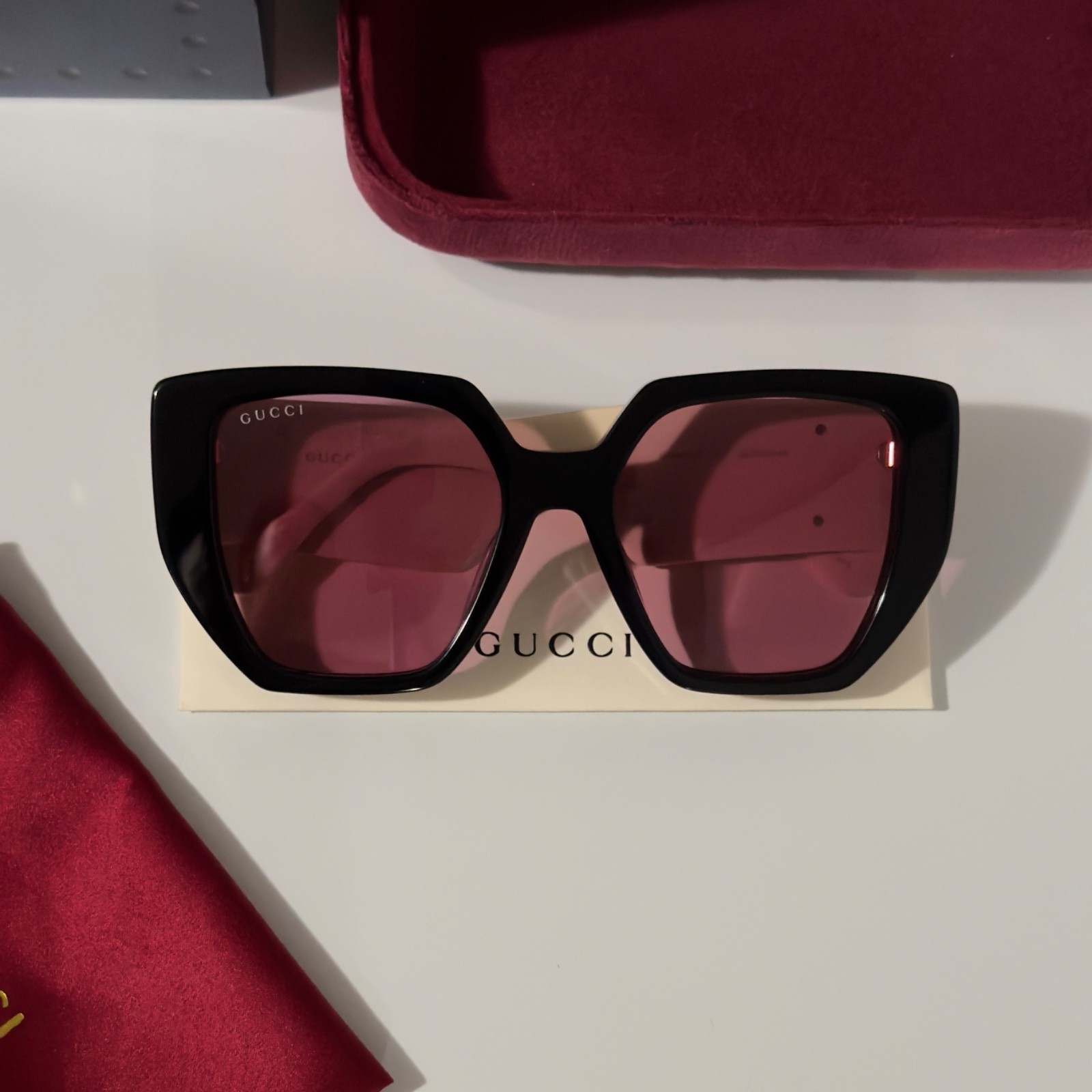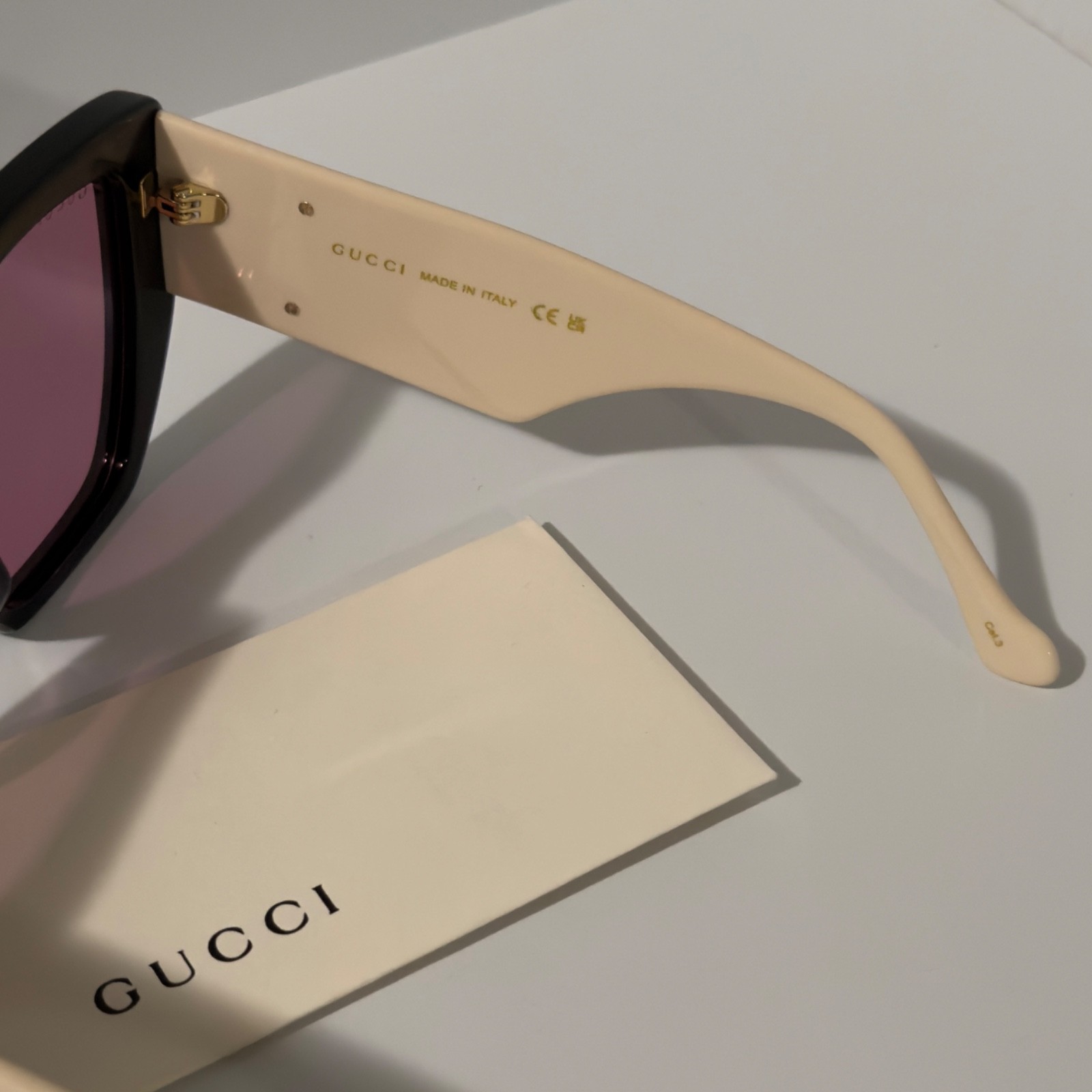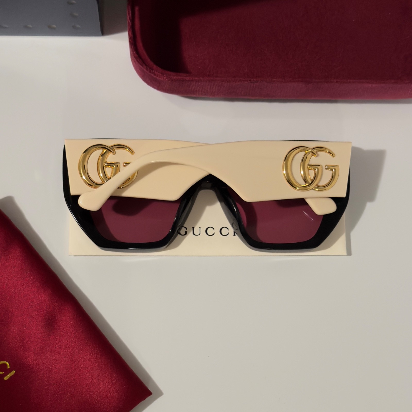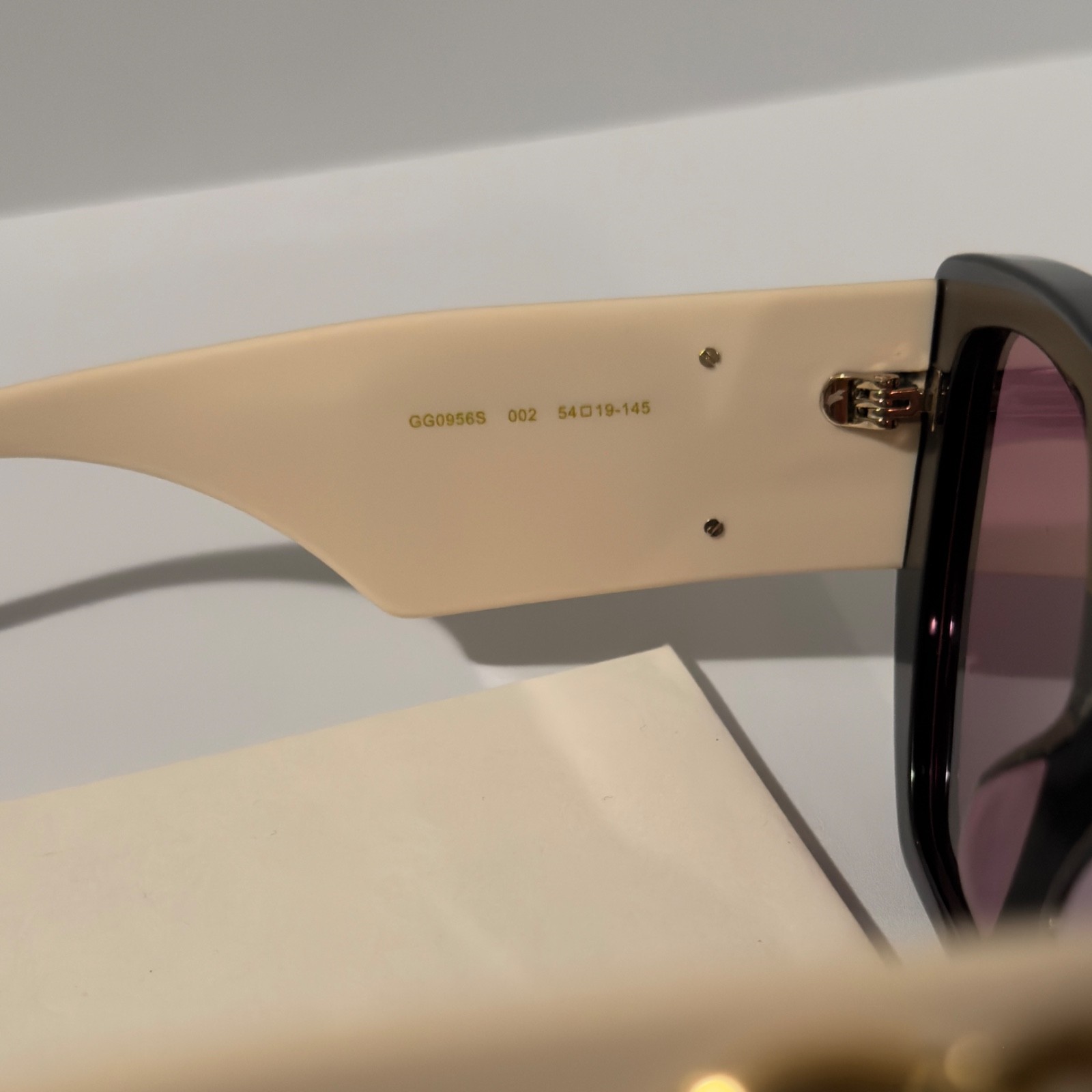 как выглядит Gucci GG0956S Black Square Women s Sunglasses Cream Arms Gold GG Pink Lens фото