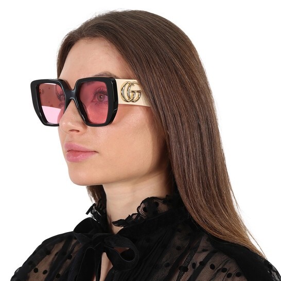 Gucci GG0956S Black Square Women s Sunglasses Cream Arms Gold GG Pink Lens