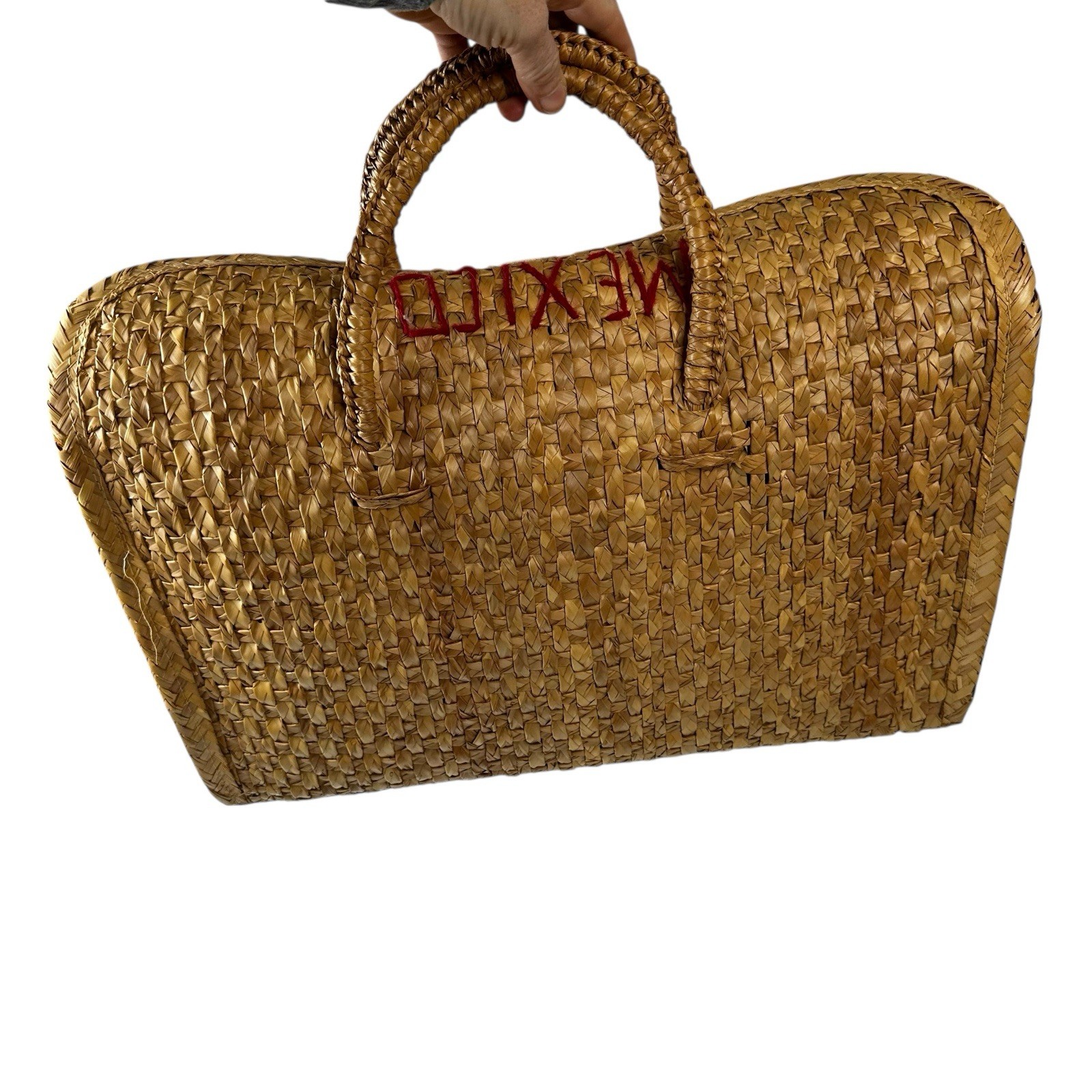 Vintage 60s Mexico Straw Woven Large Shopper Tote Beach Bag Purse 3D Flowers