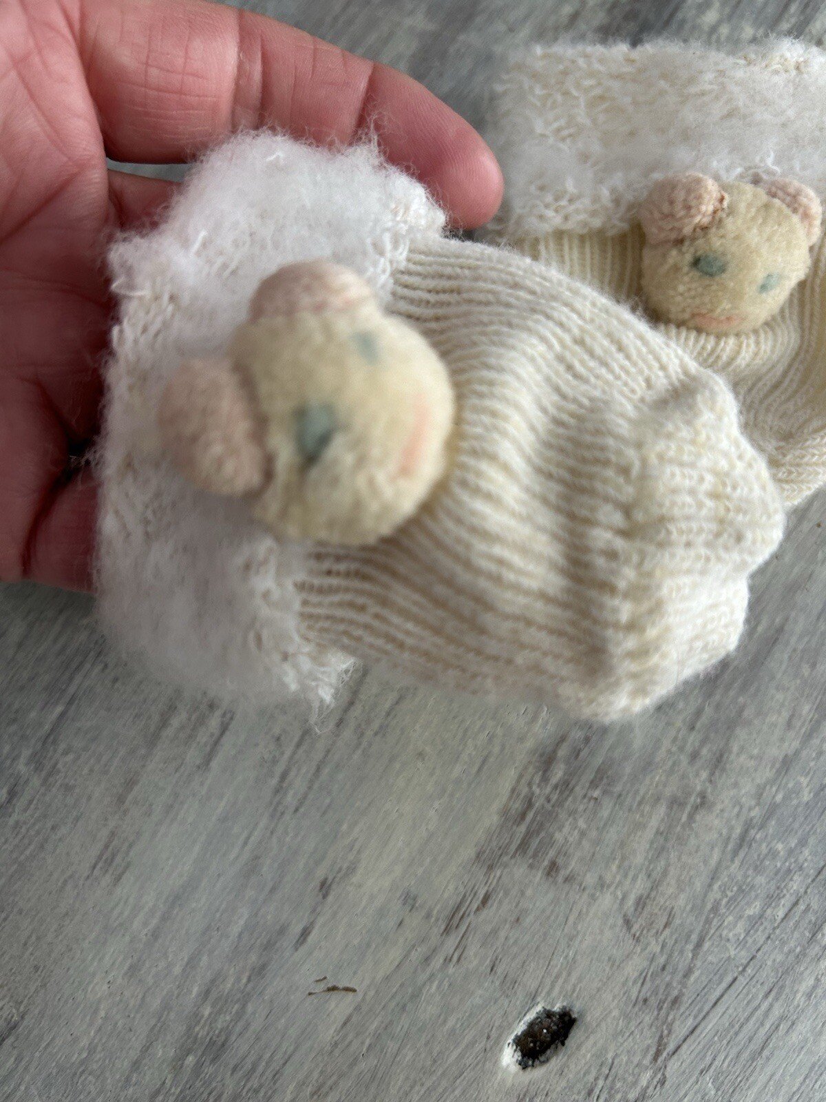 как выглядит Vintage Knit Baby Socks with Pom Pom Bear White Angora Cuffs 2a фото
