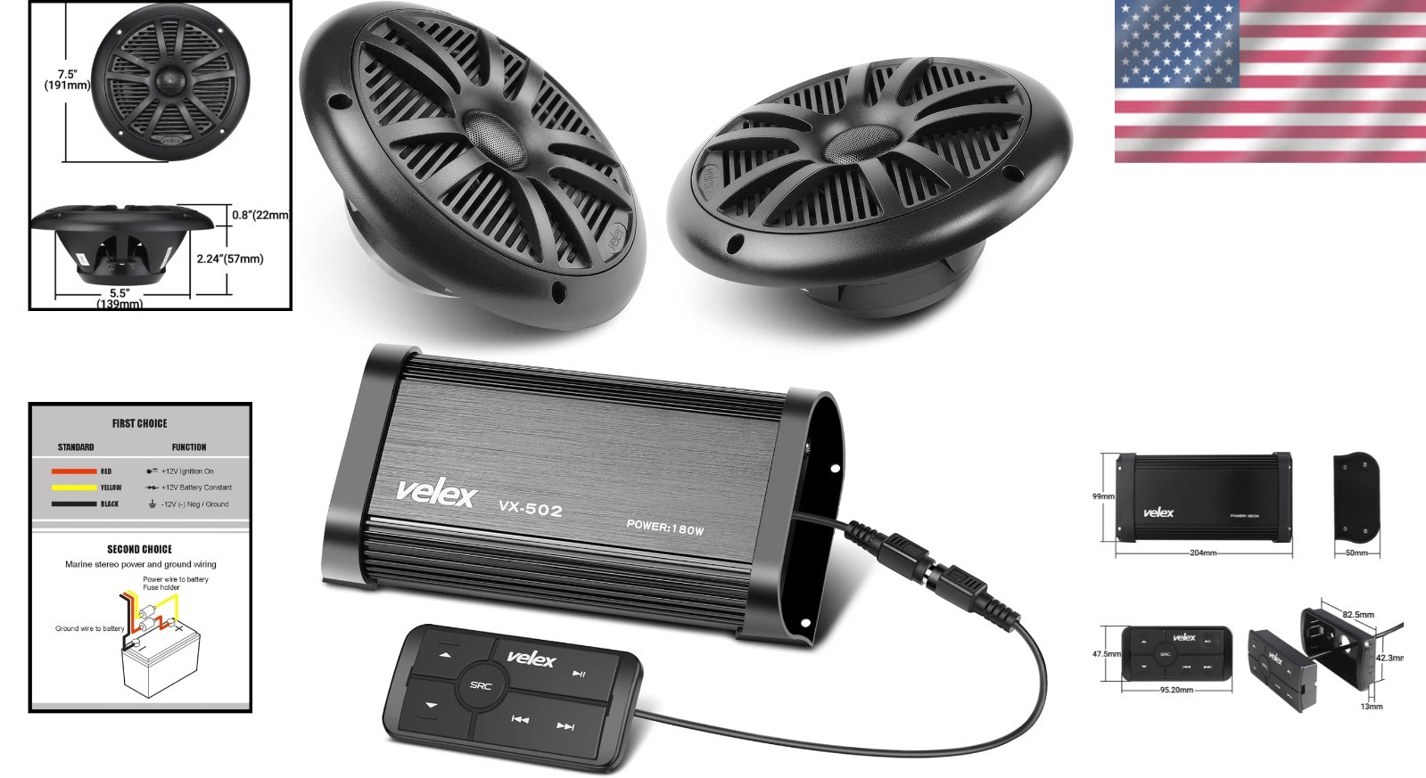 Особенности: Bluetooth Ready, USB Charging Capability, Preamp RCA Outputs, 3-Way Protection Circuitry, Waterproof, 3-Color LED Indicator, Remote Control