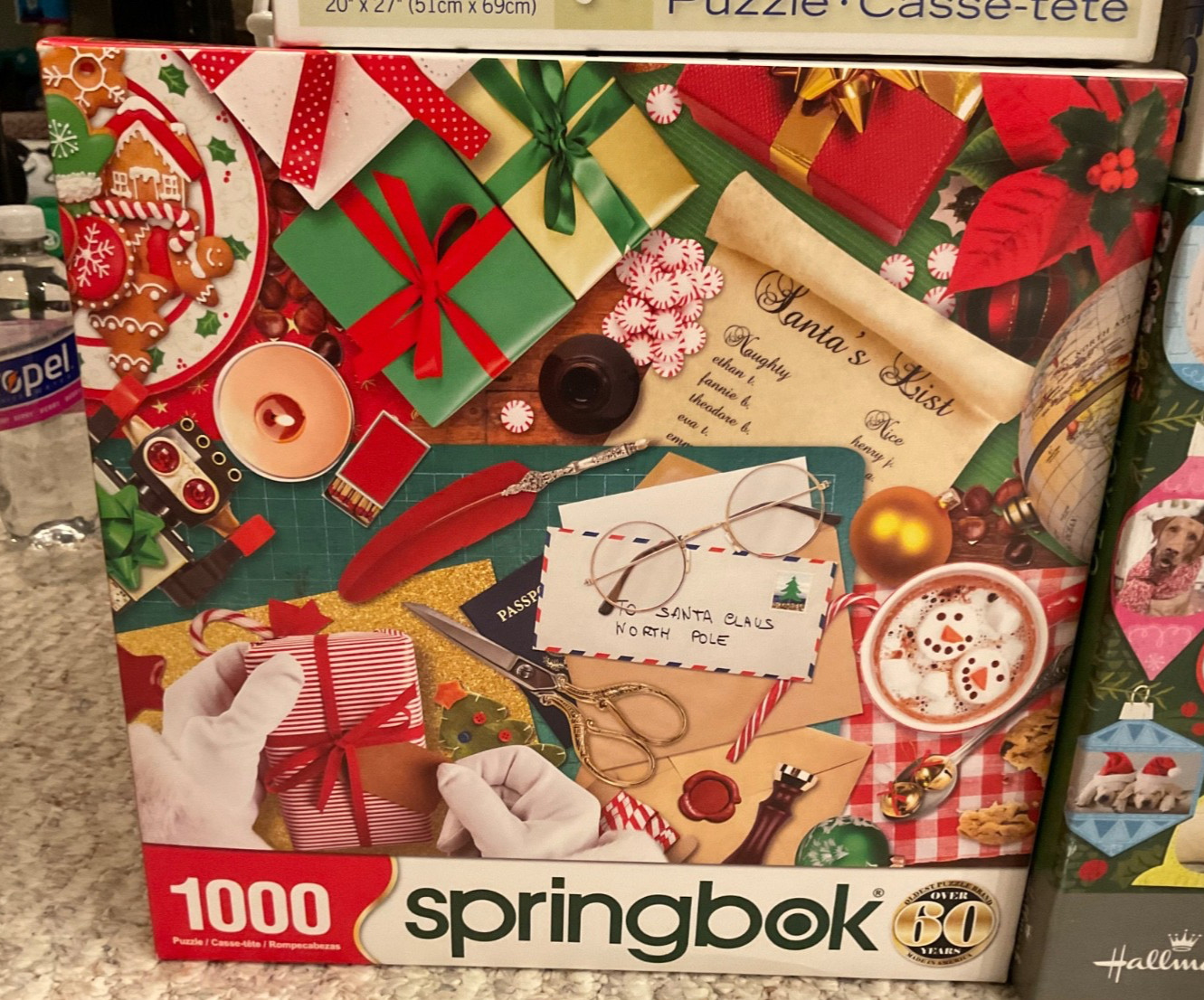 как выглядит lot of 4 , 1000 piece Christmas/winter jigsaw puzzles train, pets, santa s desk фото