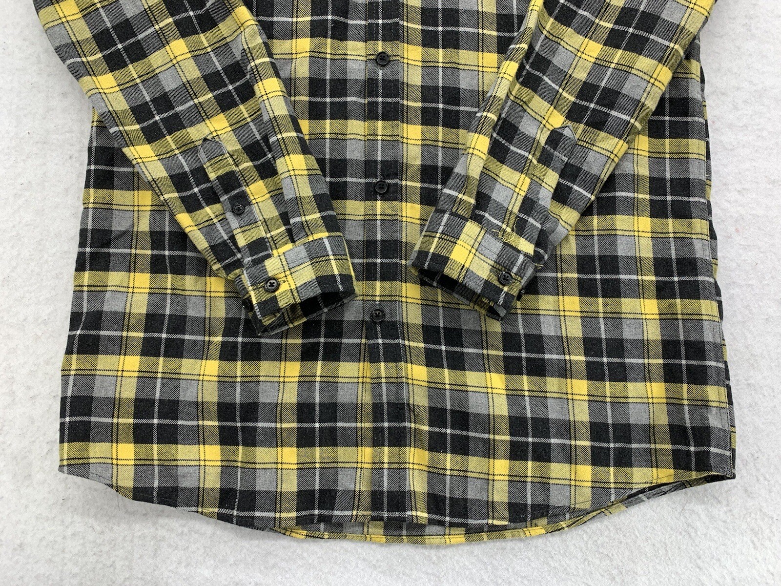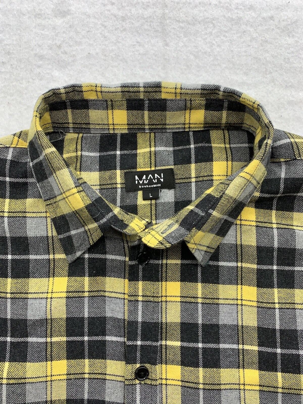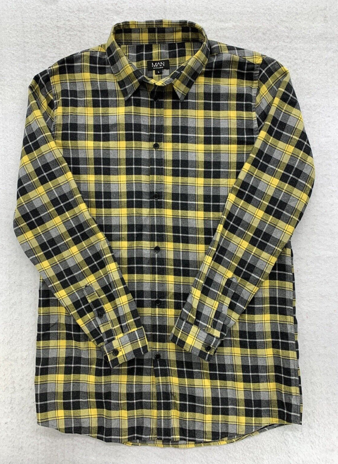 как выглядит Boohoo Man Shirt Large Yellow Black Plaid Long Sleeve Button Up Smile Emoji фото