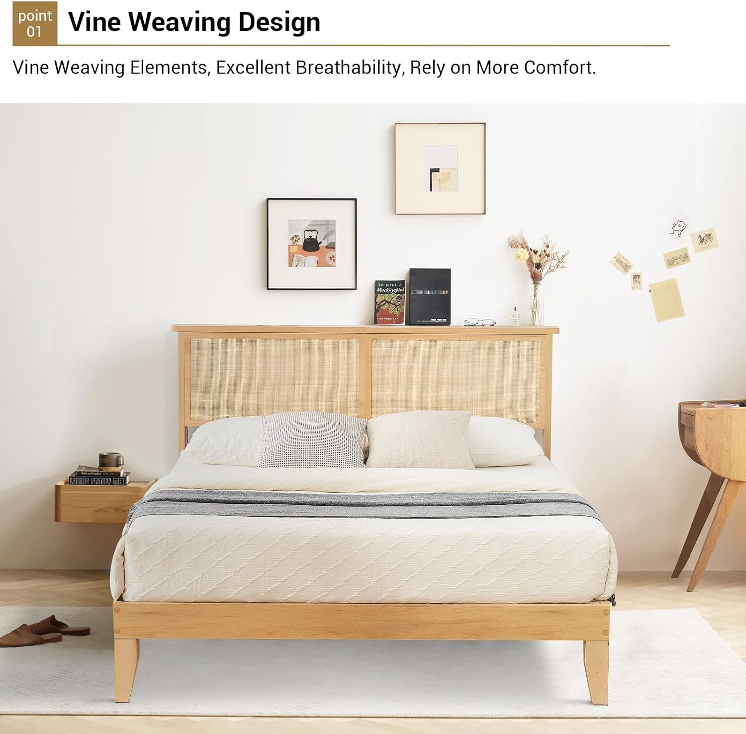 Queen Size Bed Frame with Natural Headboard Solid Wood Foundation Silent Slats