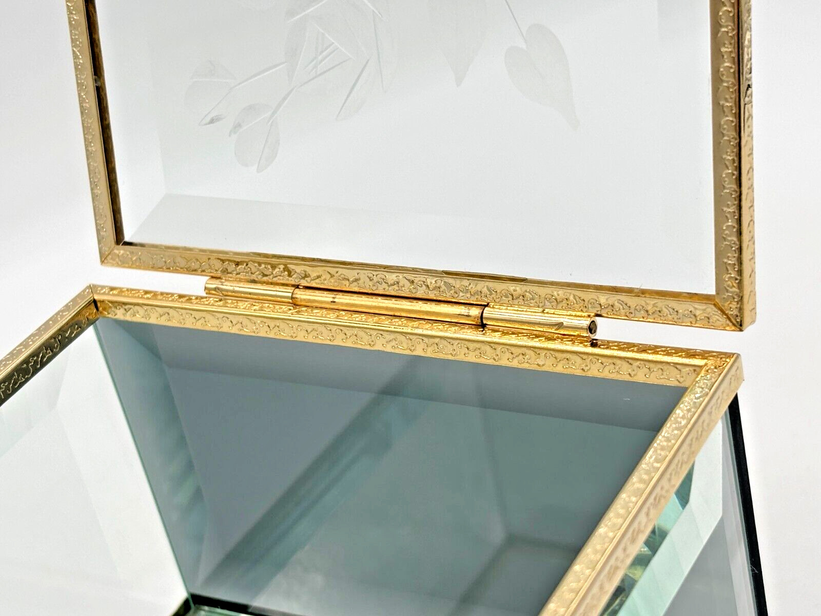 • Crystal Glass Mirrored Jewelry Trinket Box Beveled Footed Etched Flower Embossed