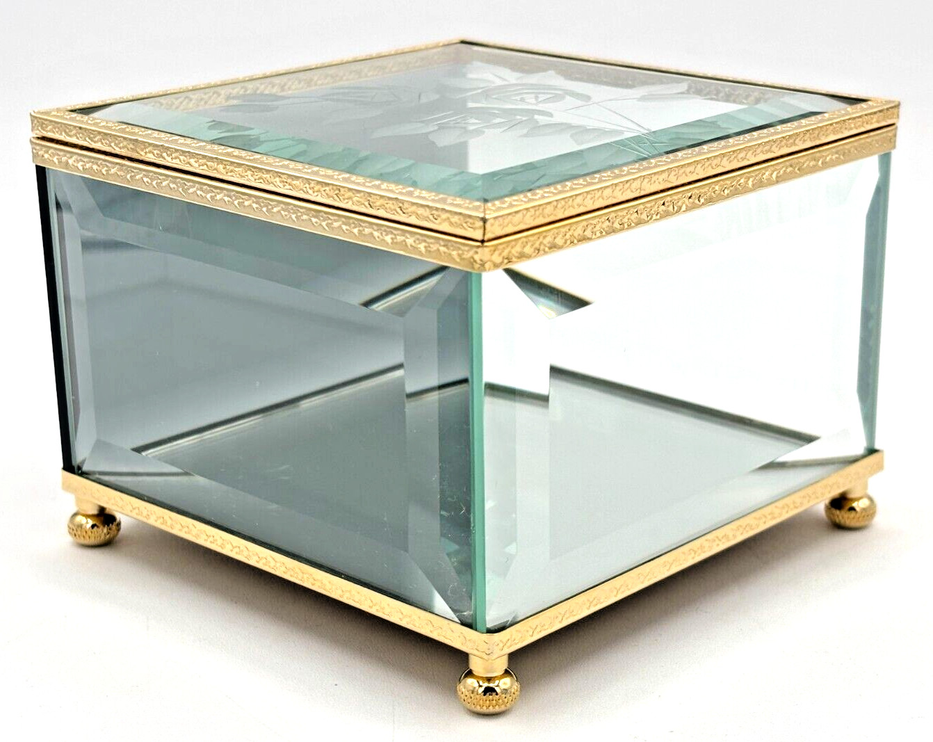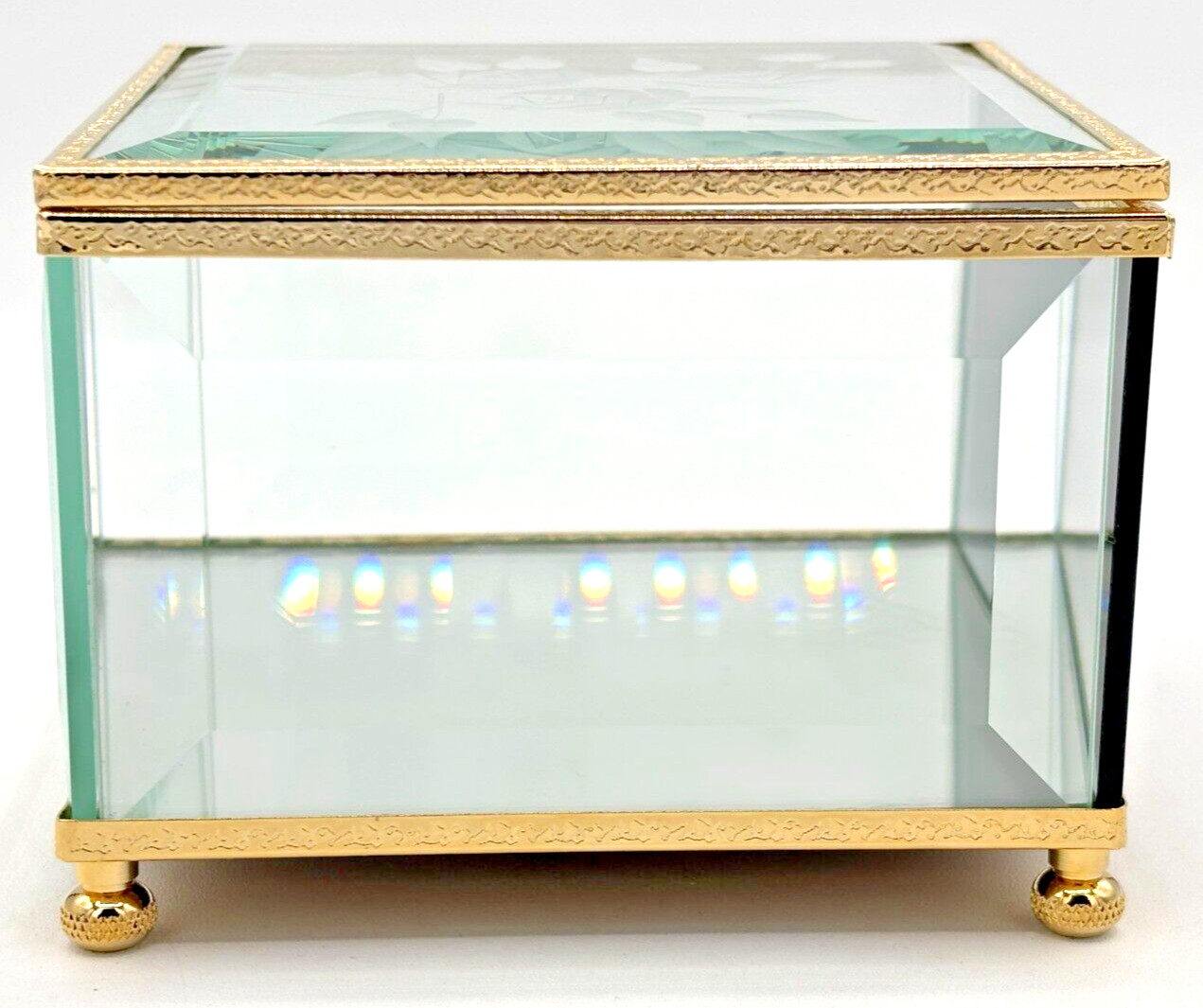 Crystal Glass Mirrored Jewelry Trinket Box Beveled Footed Etched Flower Embossed
