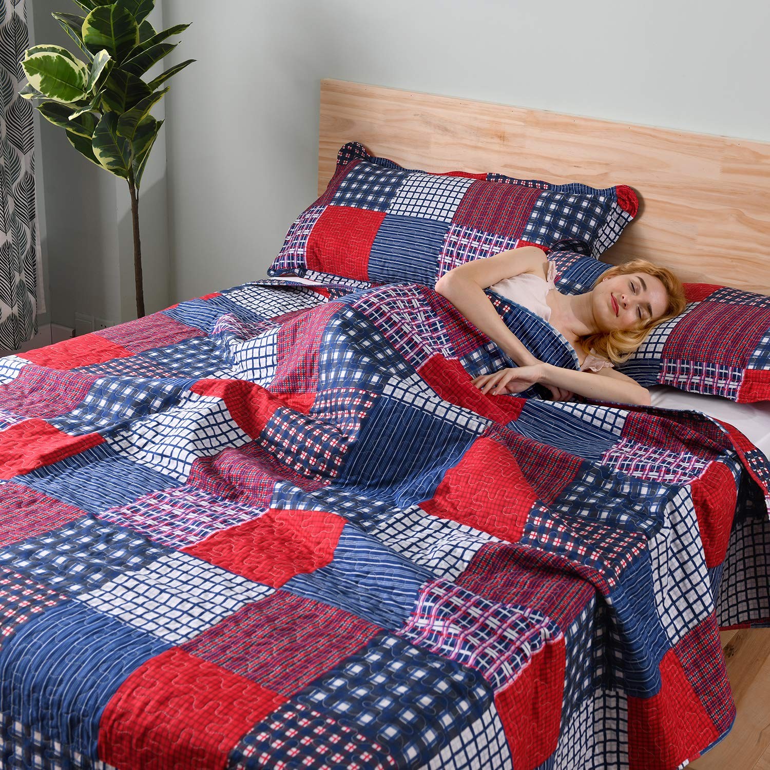 Red Blue Plaid Quilt Set King Size Country Patchwork Bedding Set Lightweight ...