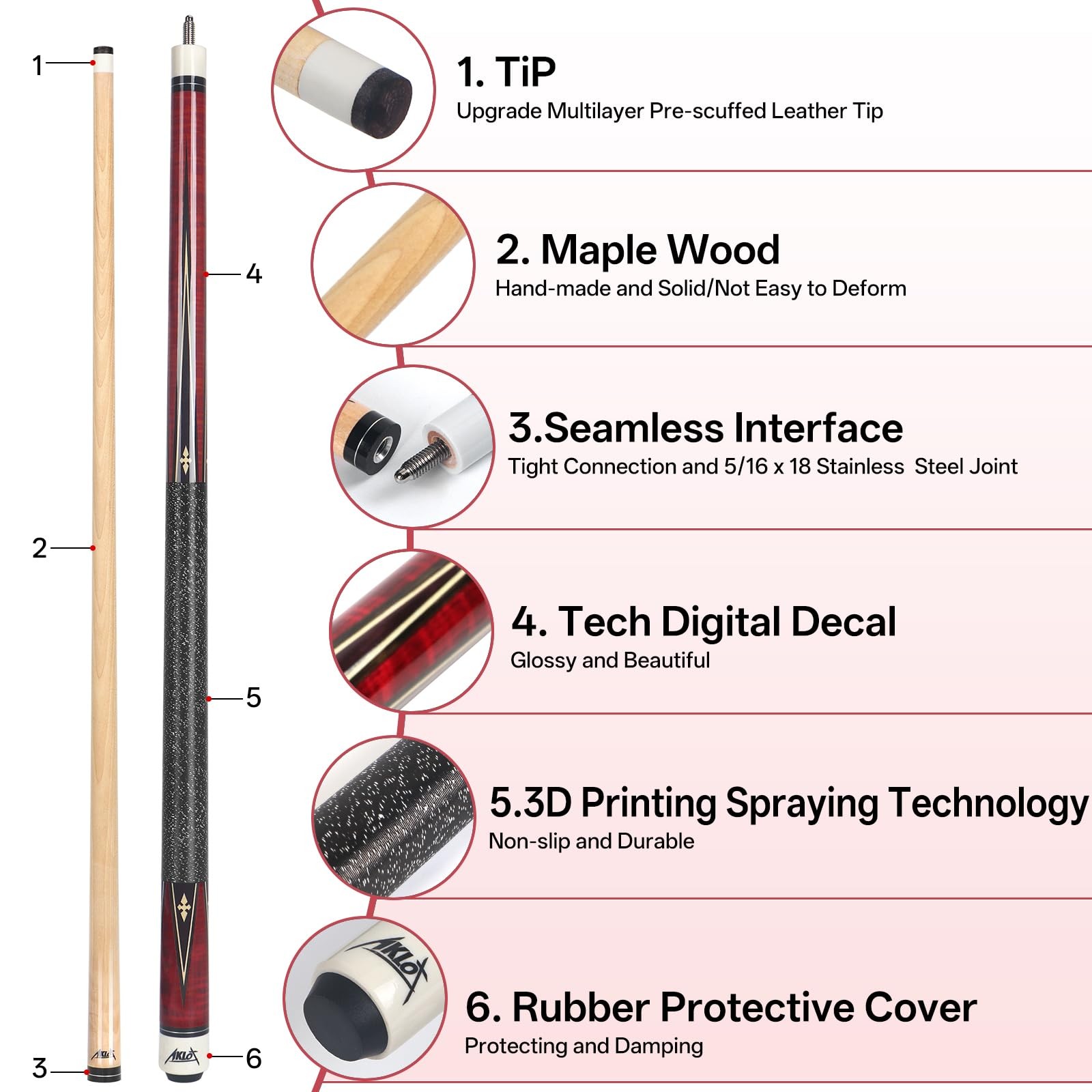 AKLOT Pool Cue Stick 58'', Canadian Maple Pro Billiard Cue 13mm Leather Tip,