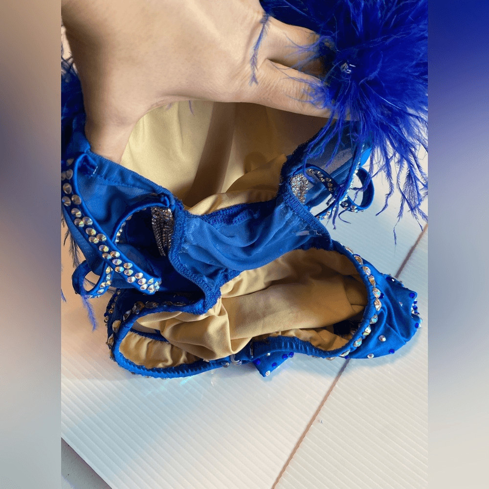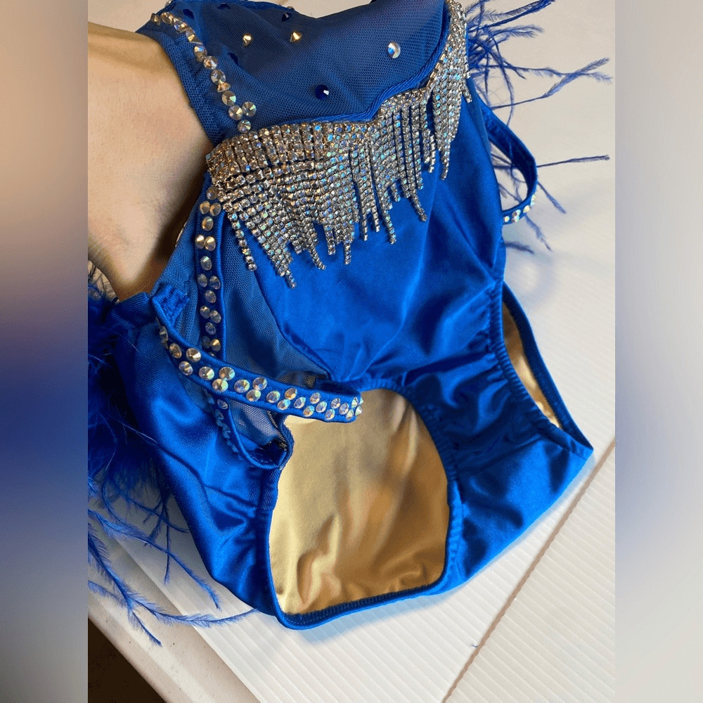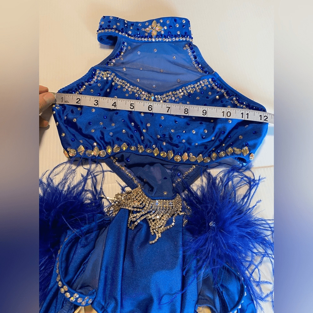 как выглядит Glamour solo custom dance costume blue feather rhinestoned fringe XLC child фото