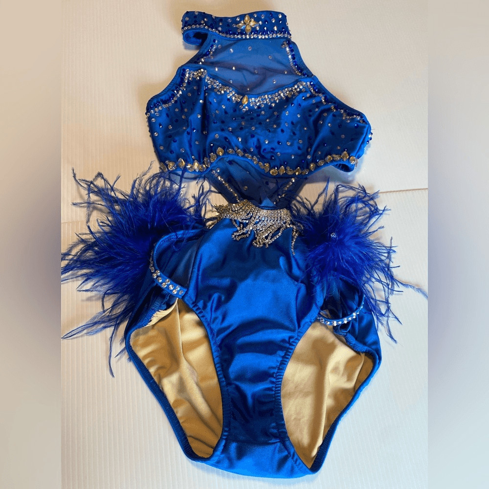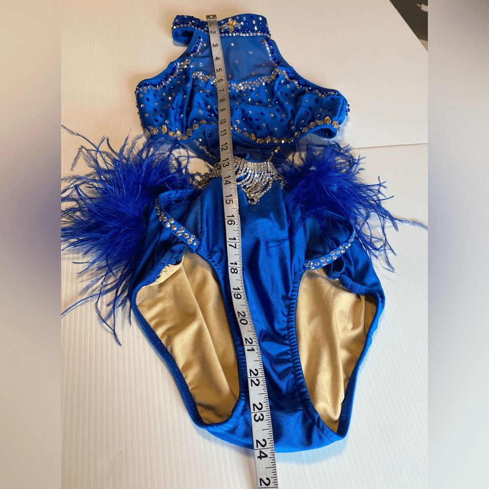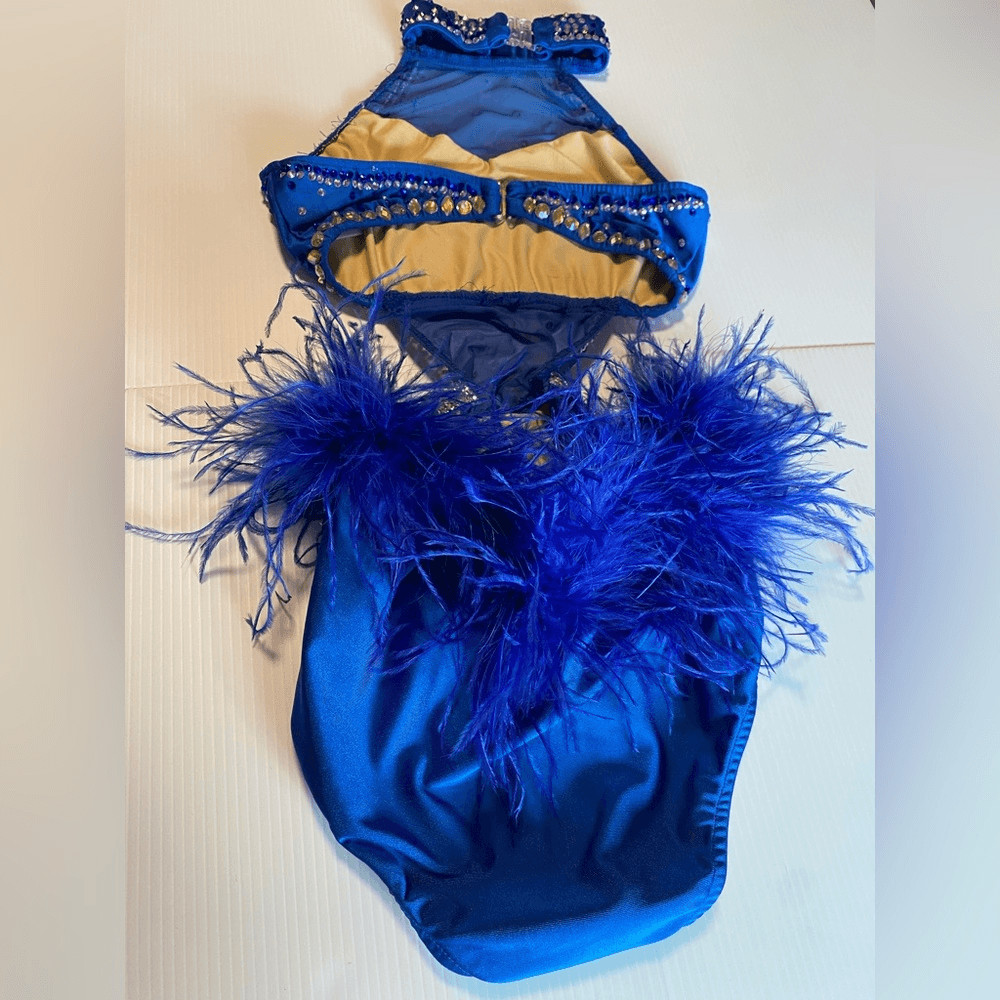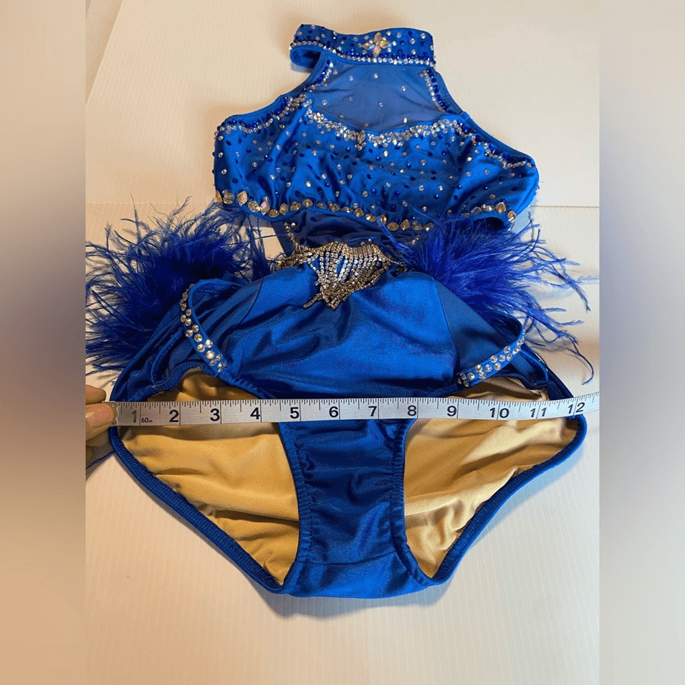 как выглядит Glamour solo custom dance costume blue feather rhinestoned fringe XLC child фото