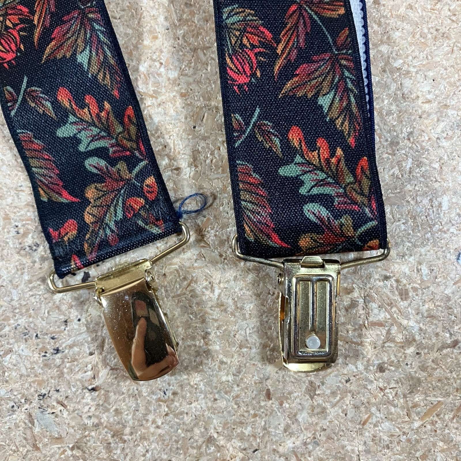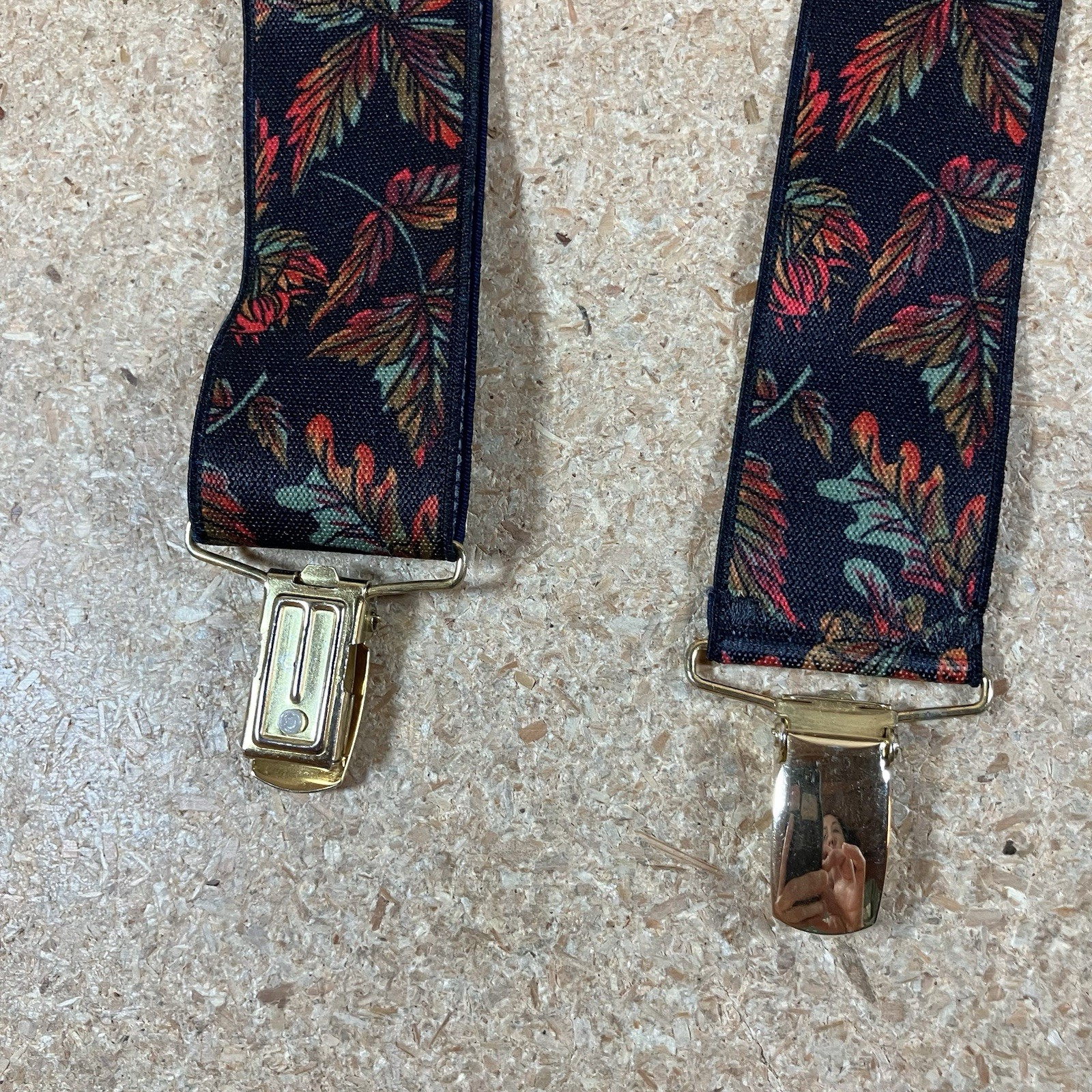 CAS West Germany Black Gold Tone Clip On Suspenders Stretch Autumn Fall Leaves