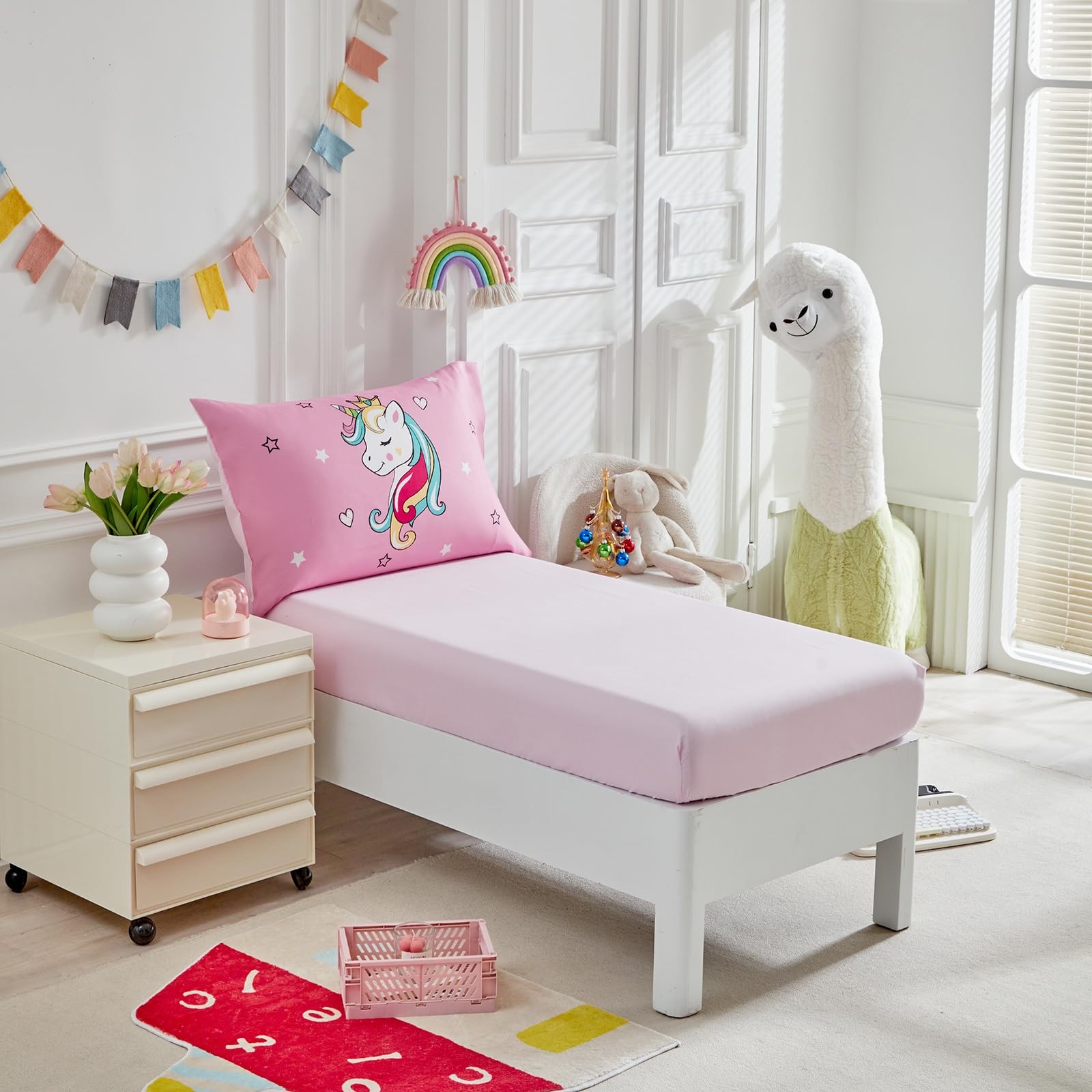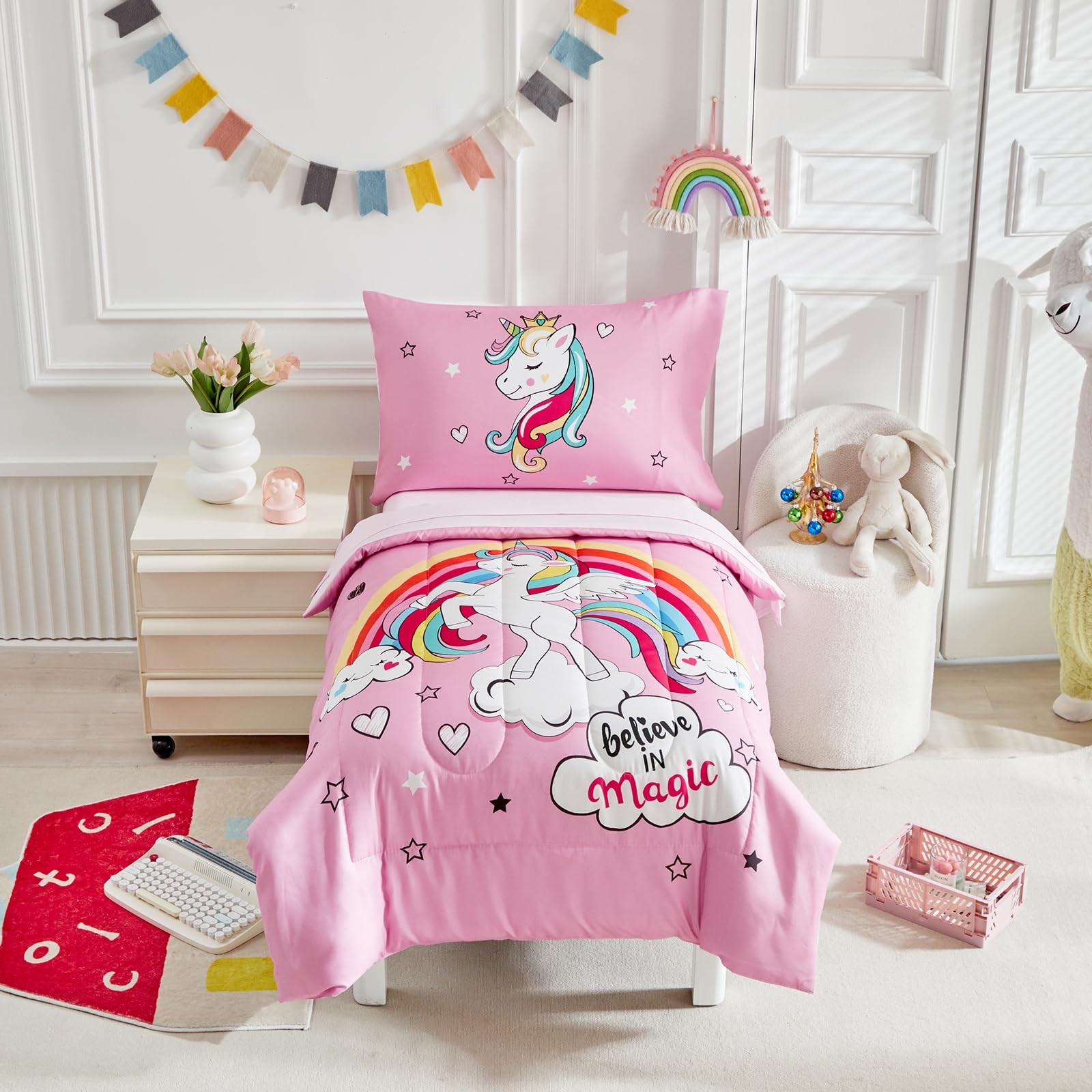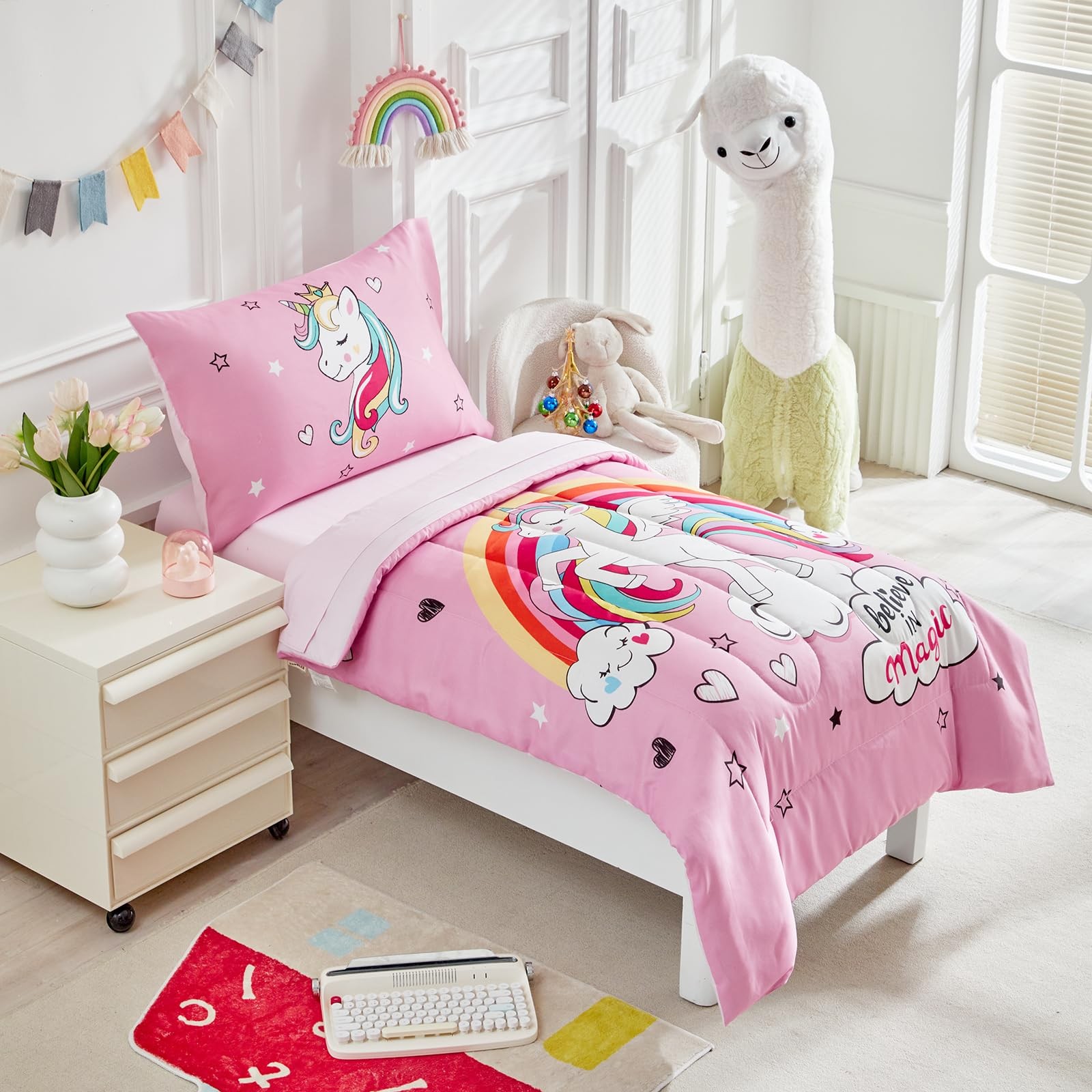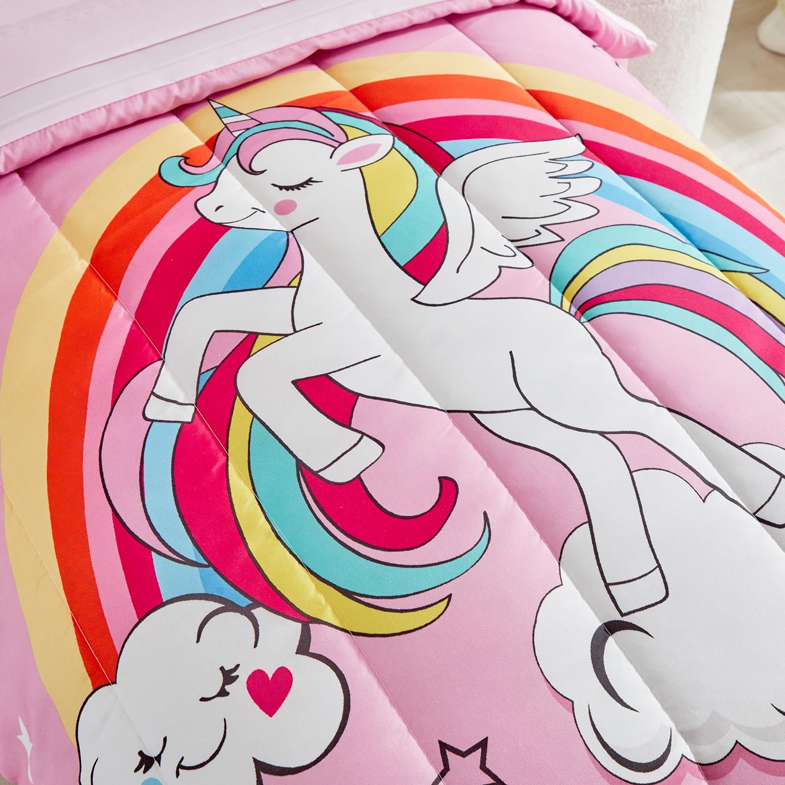 4 Pieces Bedding Set for Girls - Pink Unicorn Cartoon Stars Rainbow Print Cut...