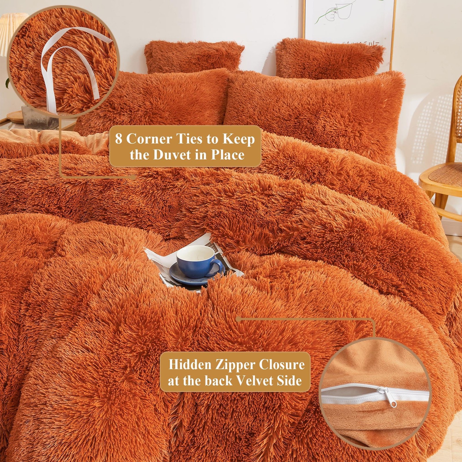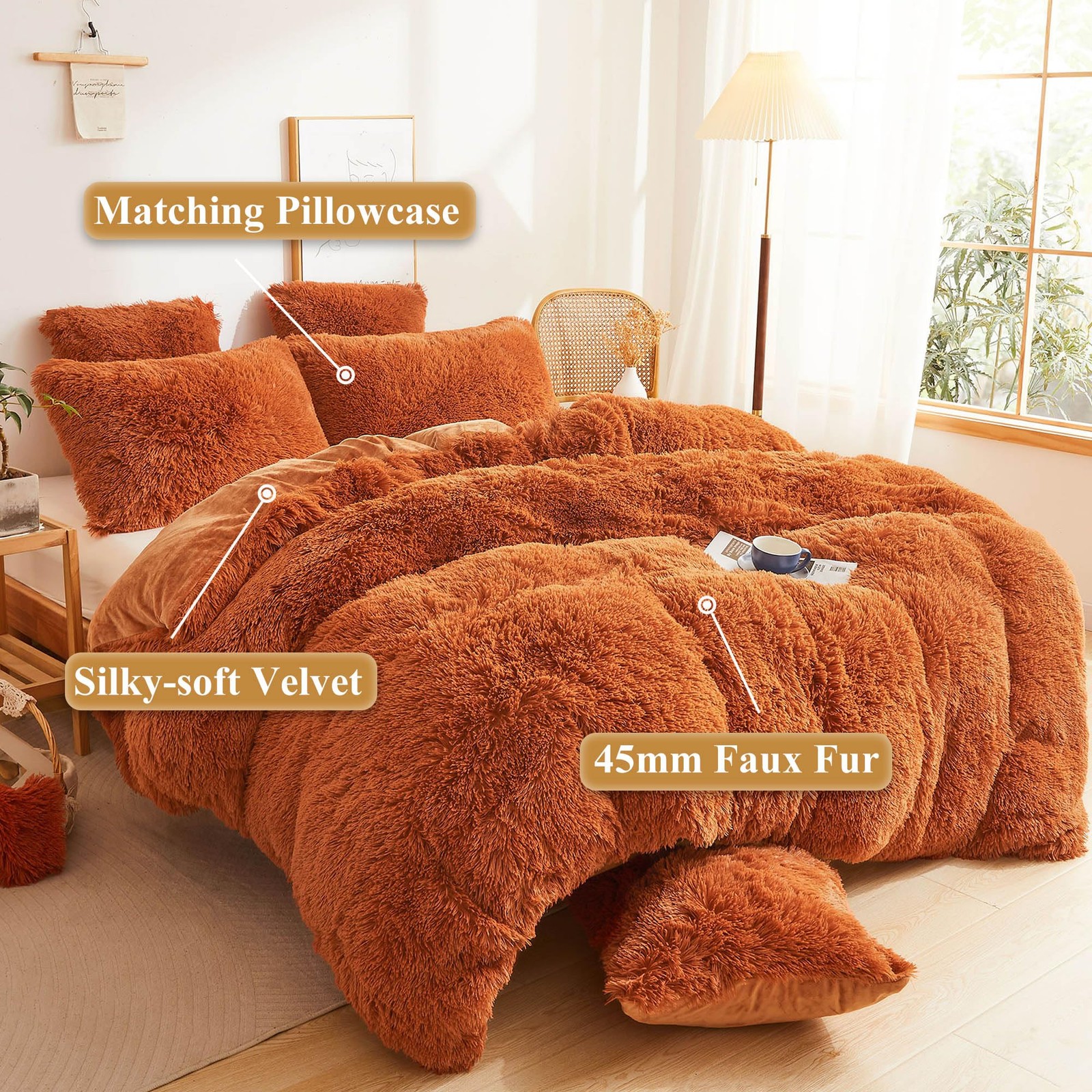 как выглядит Fluffy Faux Fur Duvet Cover Set, Luxury Ultra Soft Plush Shaggy Terracotta Be... фото