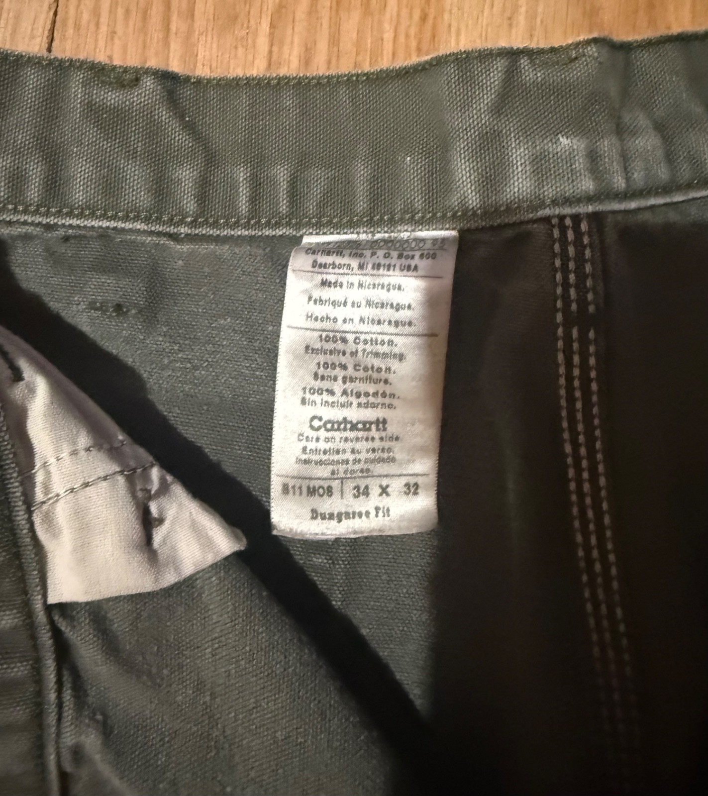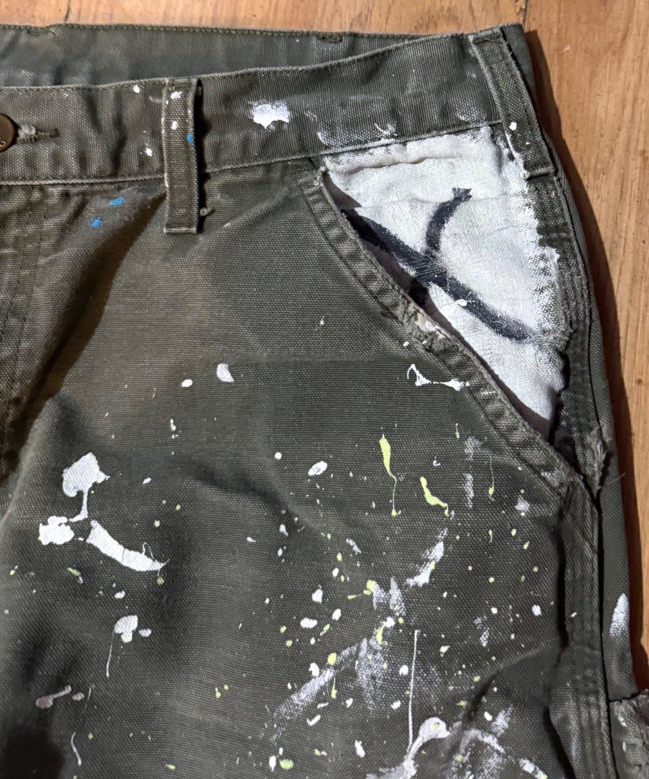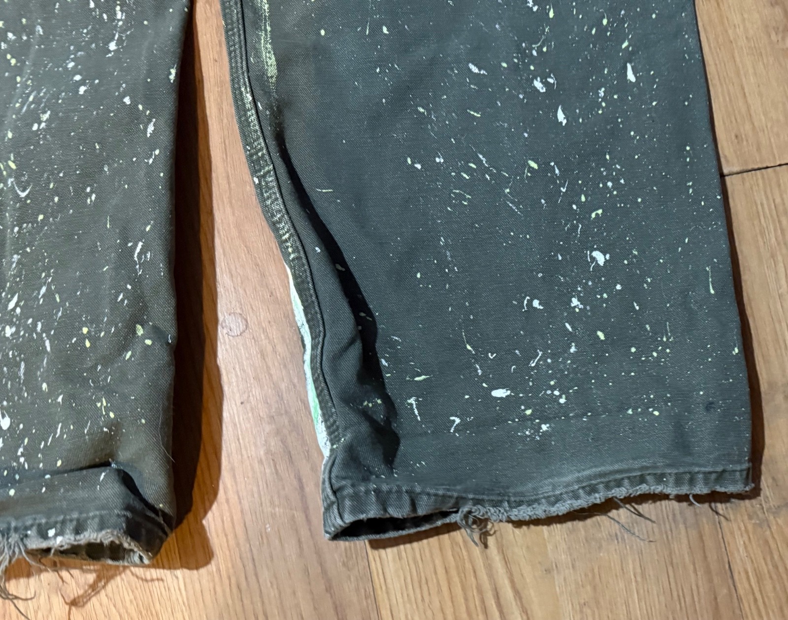 как выглядит Distressed Hand Painted Spattered Moss Green Carhartt Dungaree Pants B11 34 x 32 фото