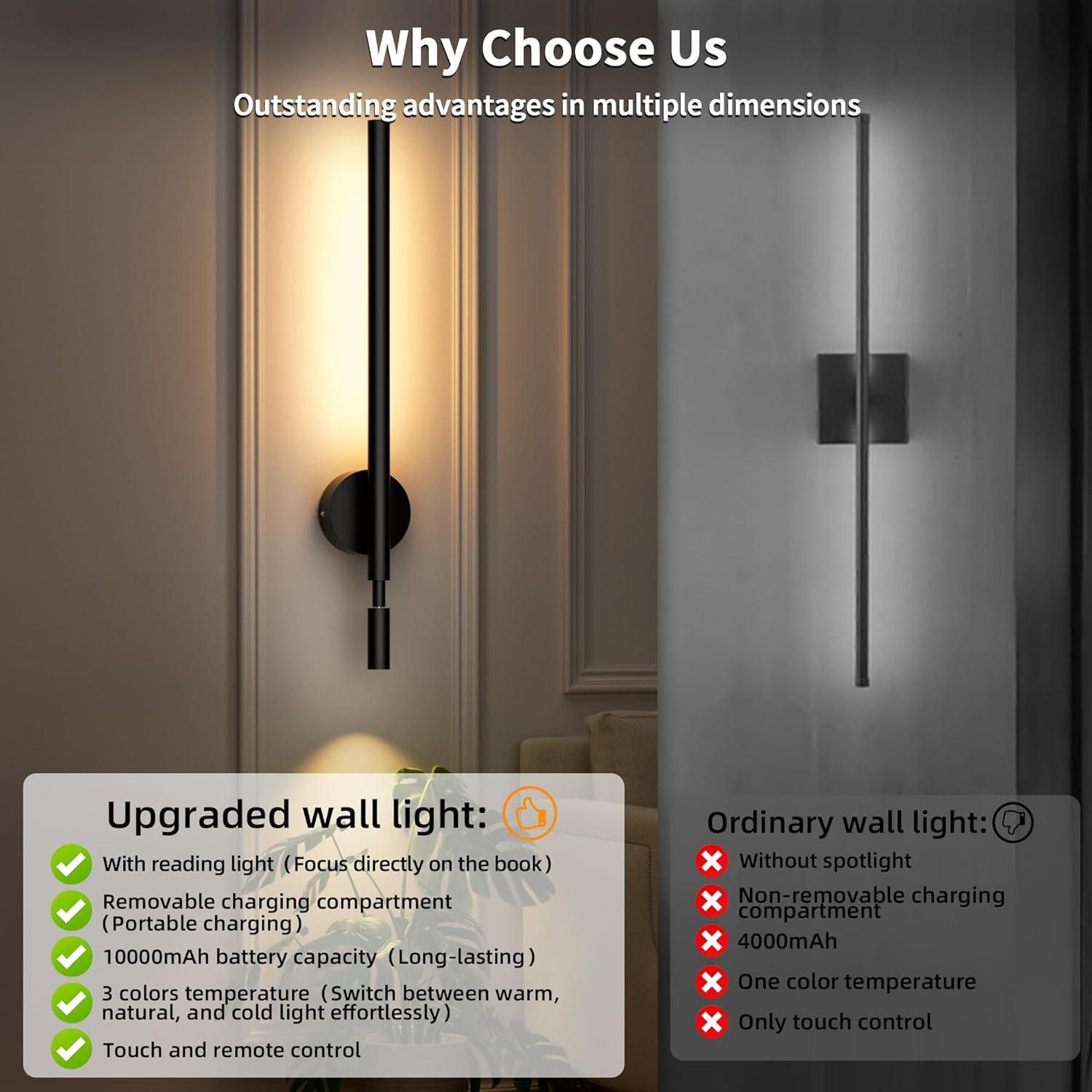 Battery Operated Wall Sconces Set of 2 with Reading Spotlights Rechargeable LED
