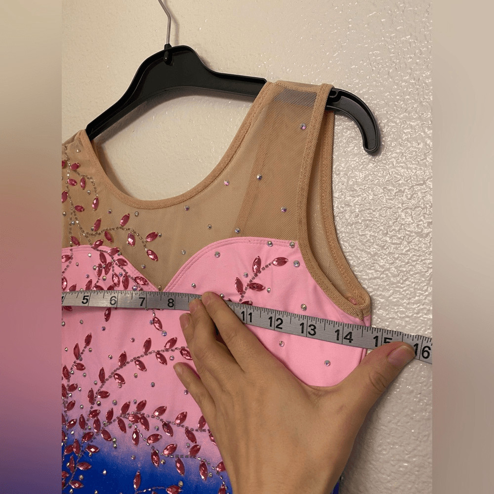 как выглядит Custom solo dance ice skating ballet costume blue pink ombre stoned dress SA фото