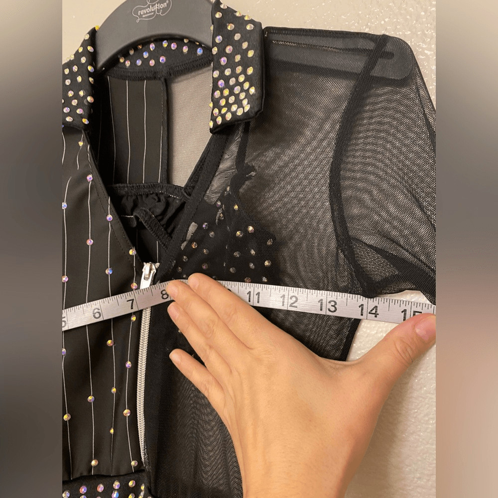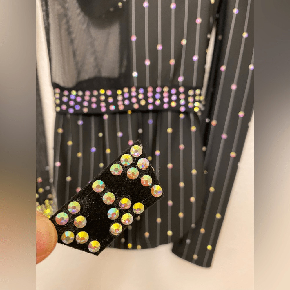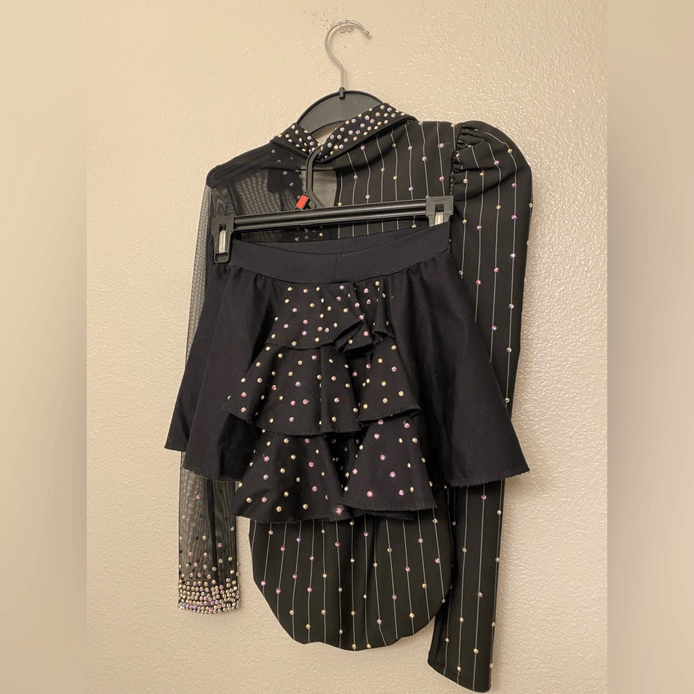 Kelle solo dance costume 3 piece black pin stripe leotard skirt 5333 stoned LC