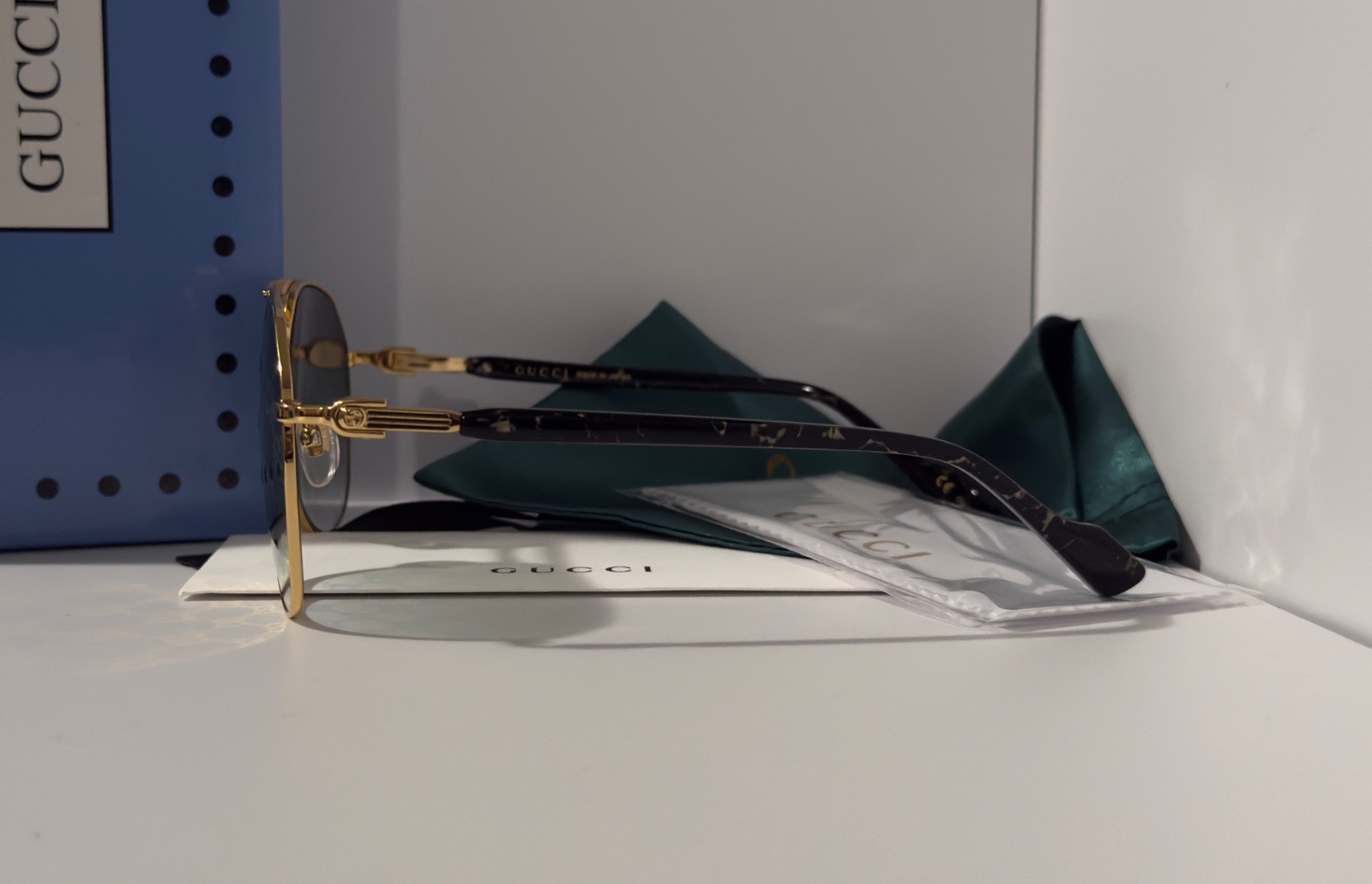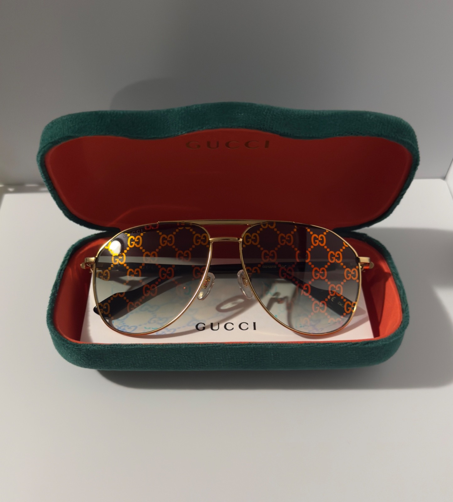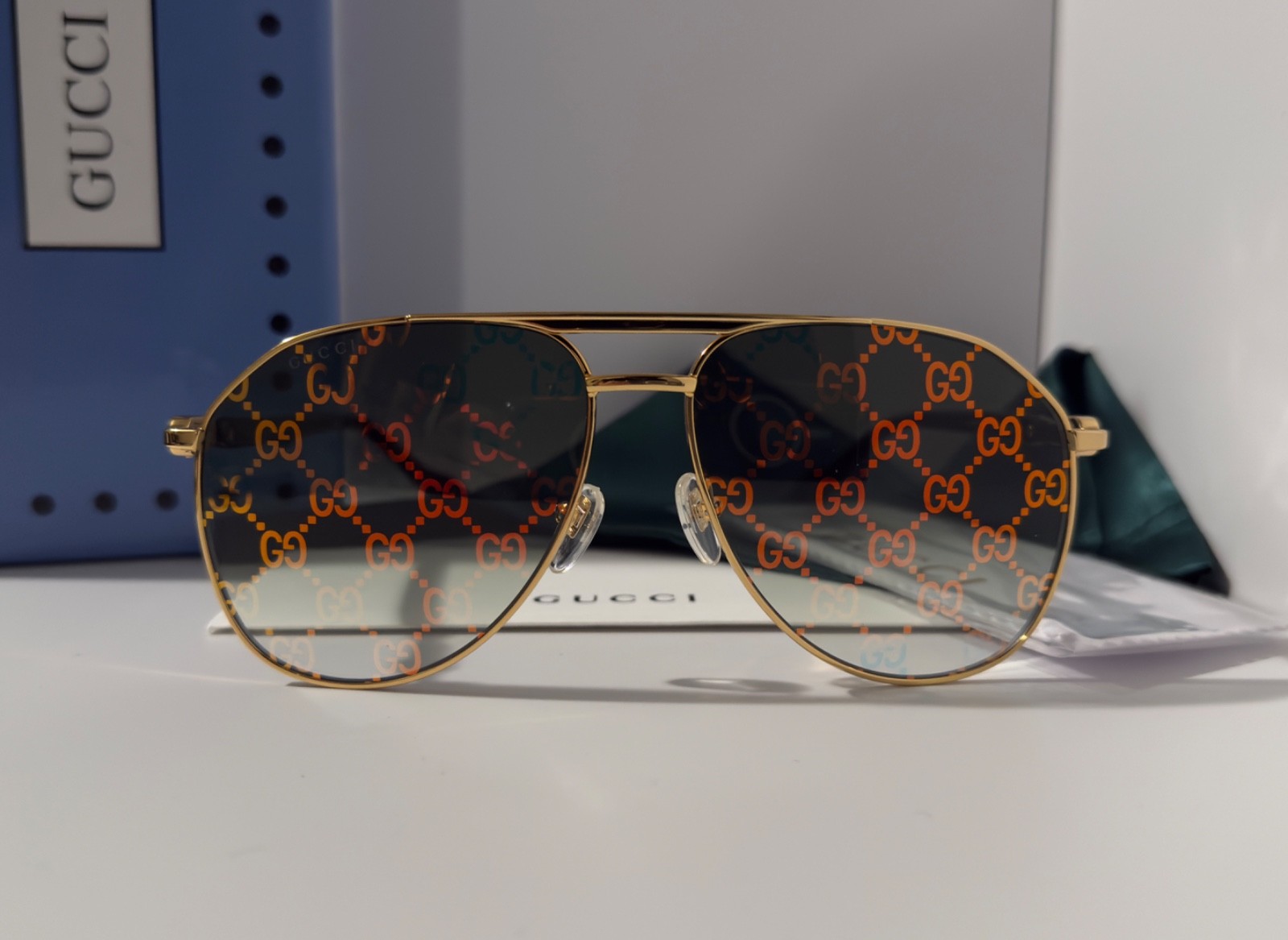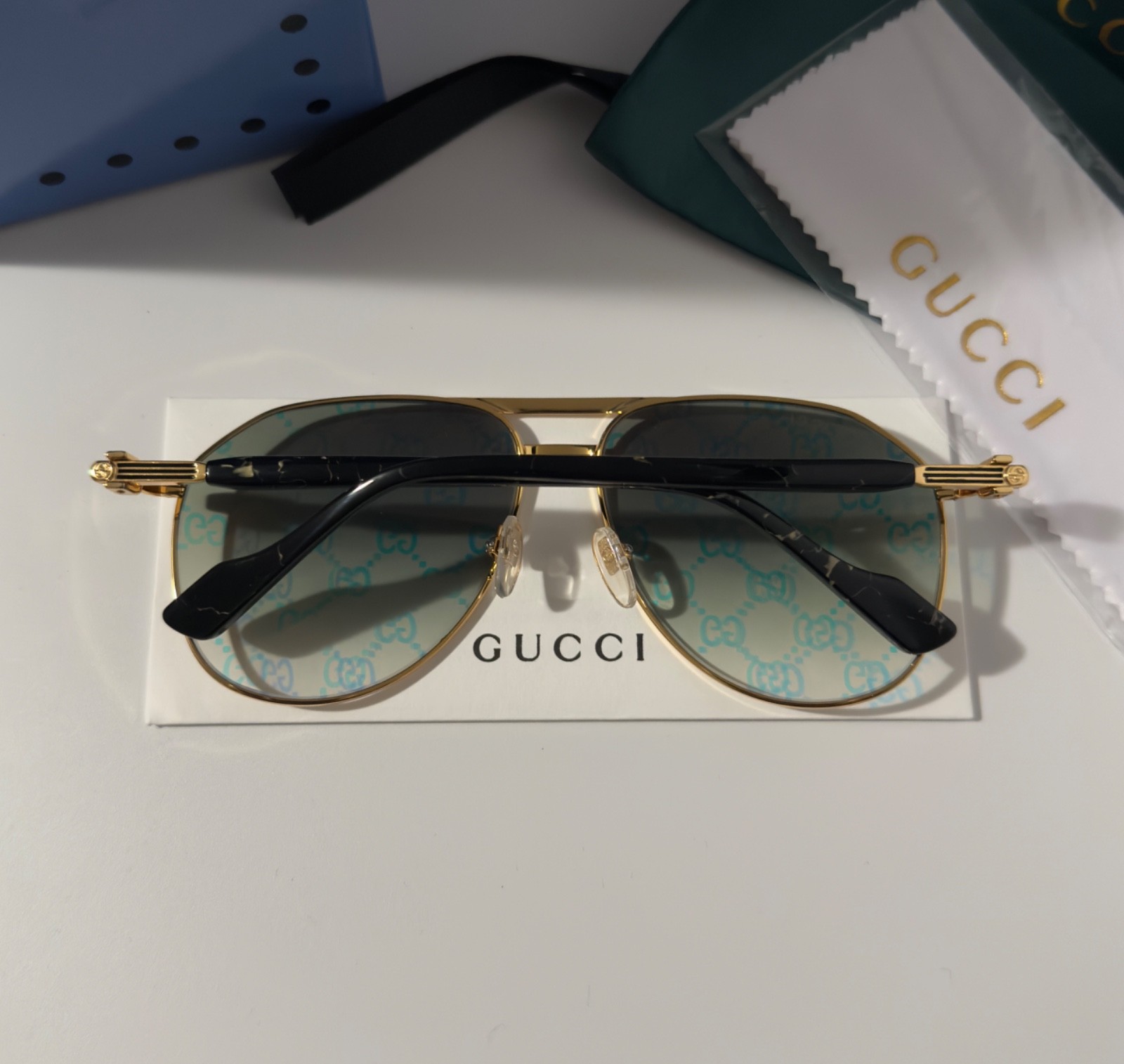 как выглядит Gucci GG1220S 004 Aviator Sunglasses Gold Green GG Pattern Lens 59mm Ships Today фото