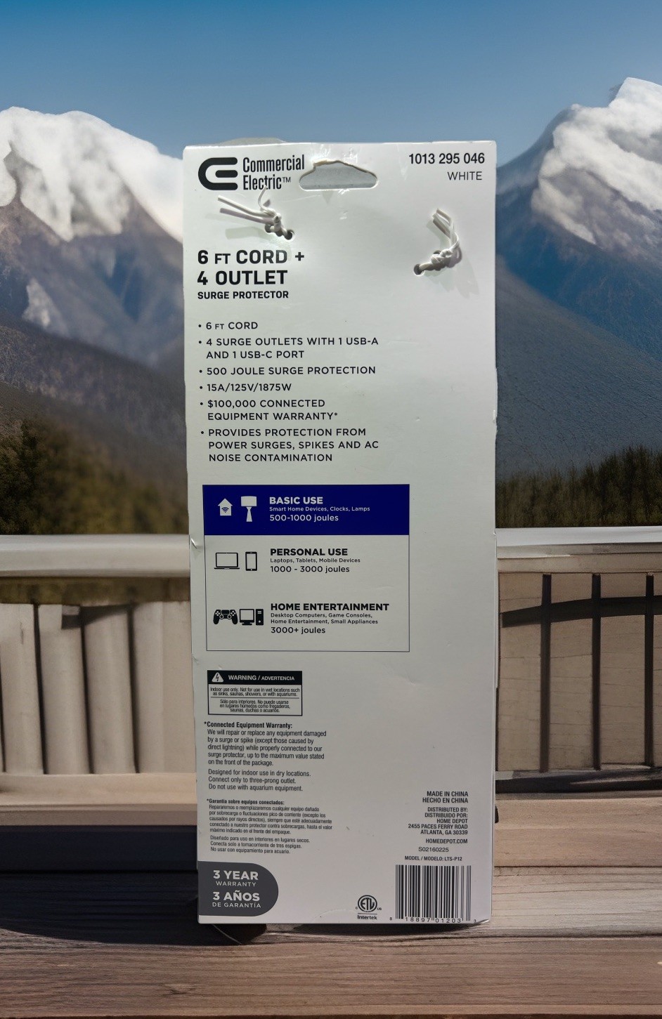 Commercial Electric 6 ft 4-Outlet Surge Protector w USB-A USB-C White