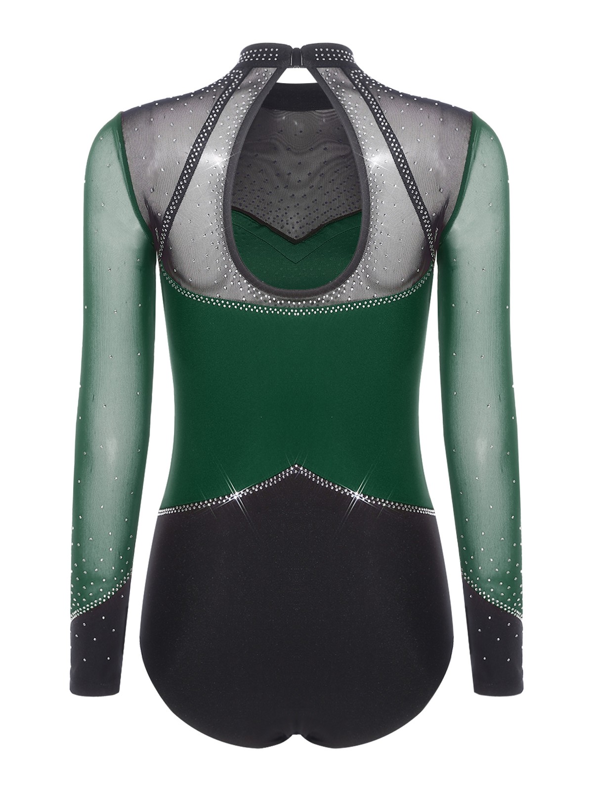 Women's Rhinestones Mesh Long Sleeve Leotard BodySuit Color Blocking Jumpsuit
