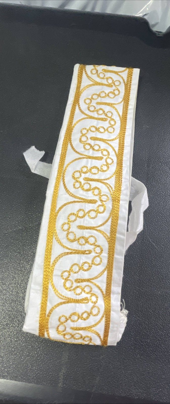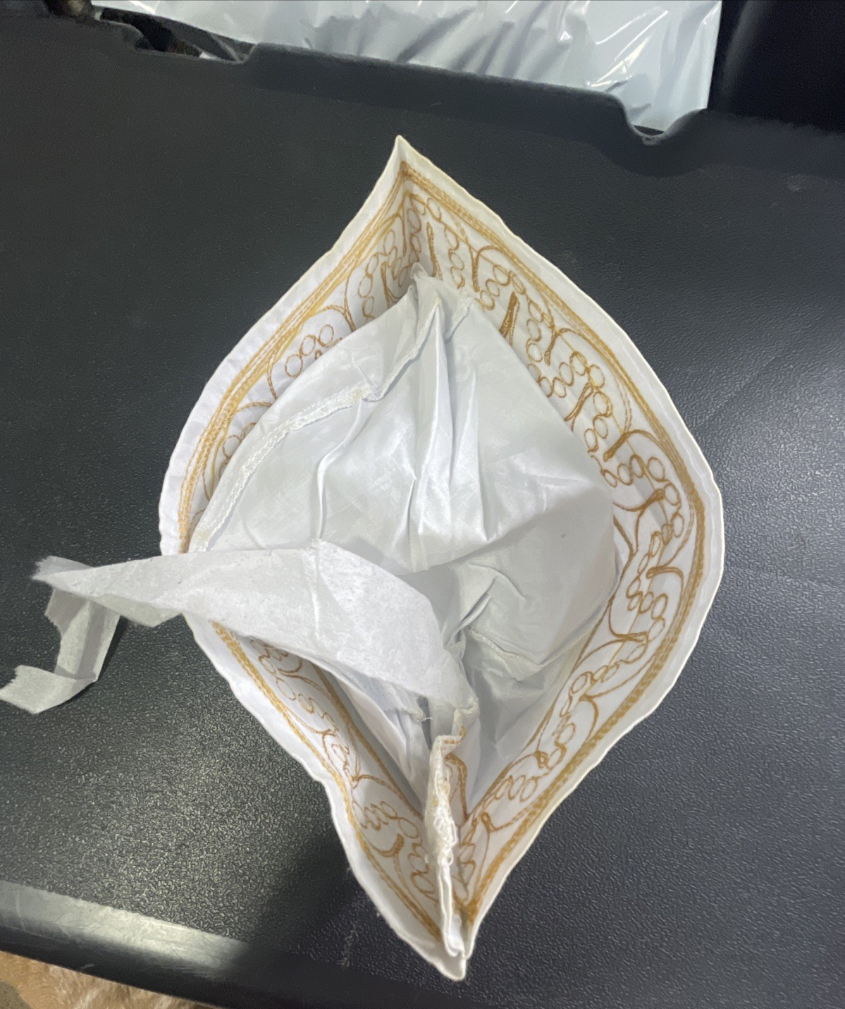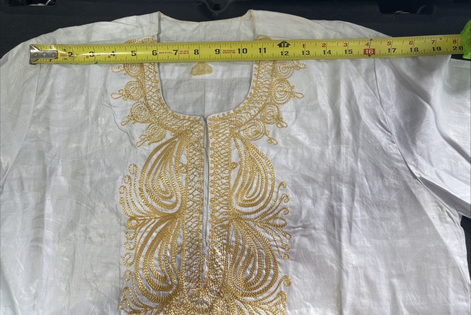 African Nigerian White Satin Dashiki Shirt Golden Embroidery Kufi Cap Set