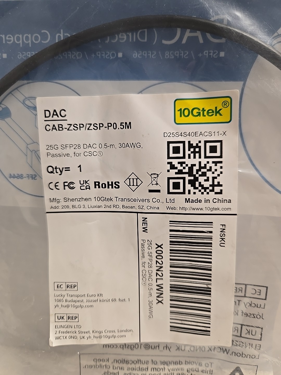 как выглядит 10Gtek 25G SFP28 SFP DAC Cable - 25GBASE-CR to Passive 0.5m, фото
