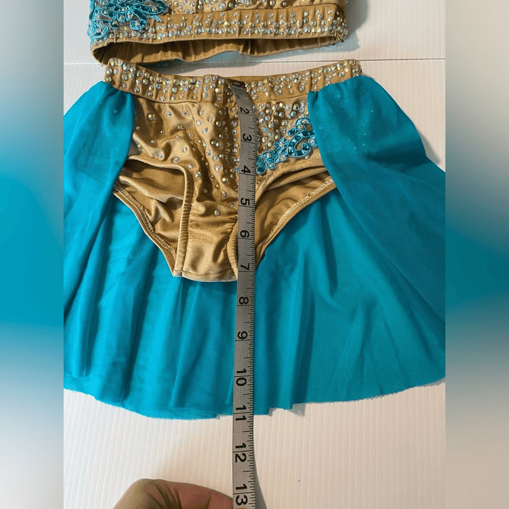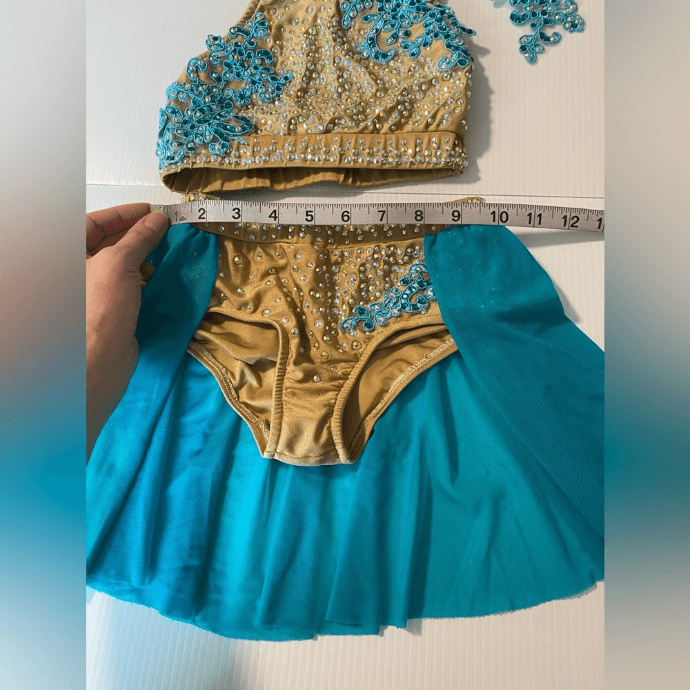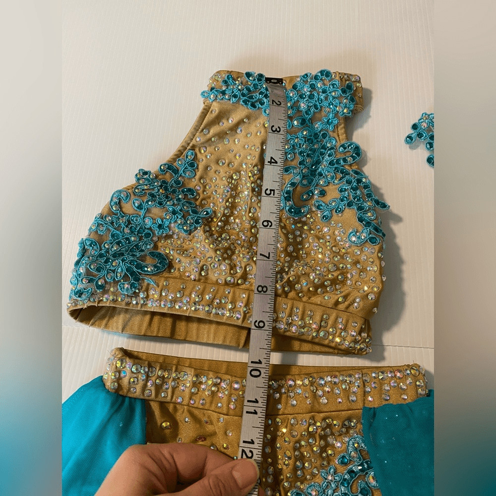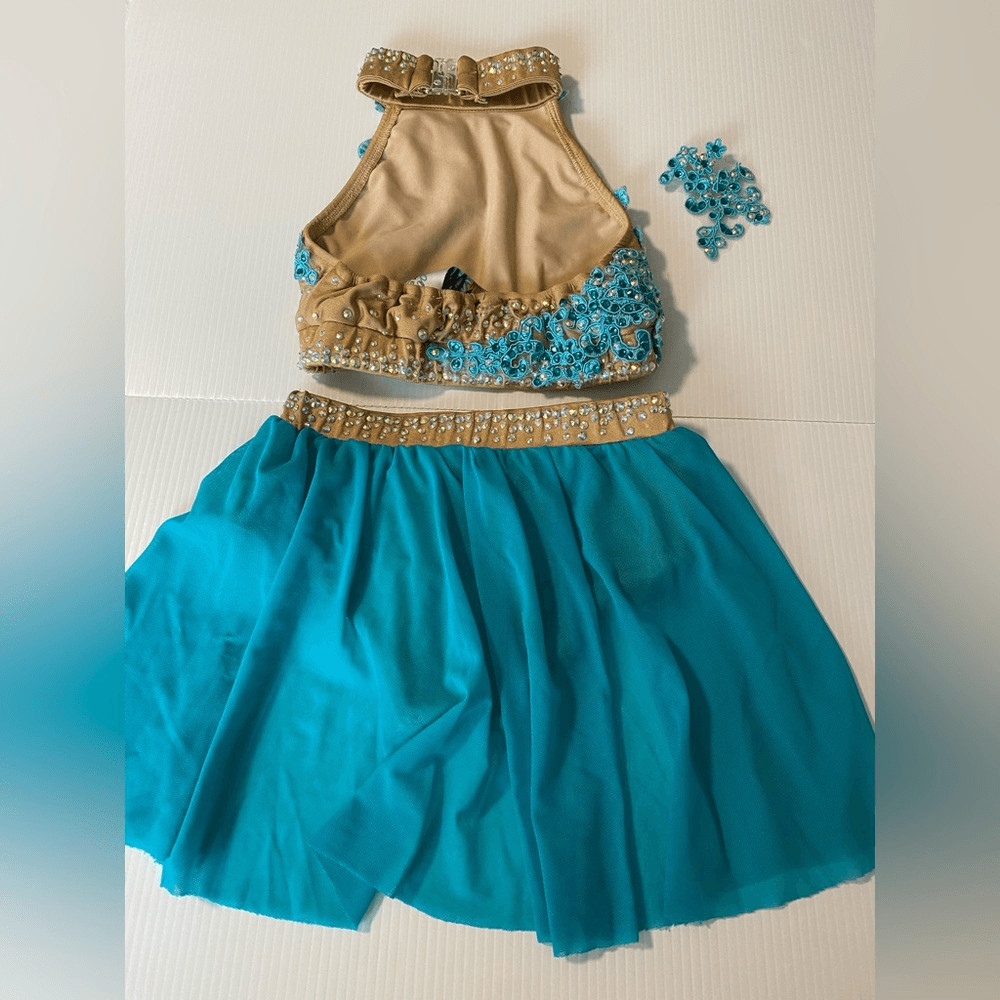 как выглядит Glamour solo dance costume 2 piece teal tan embellished MC-Medium child фото