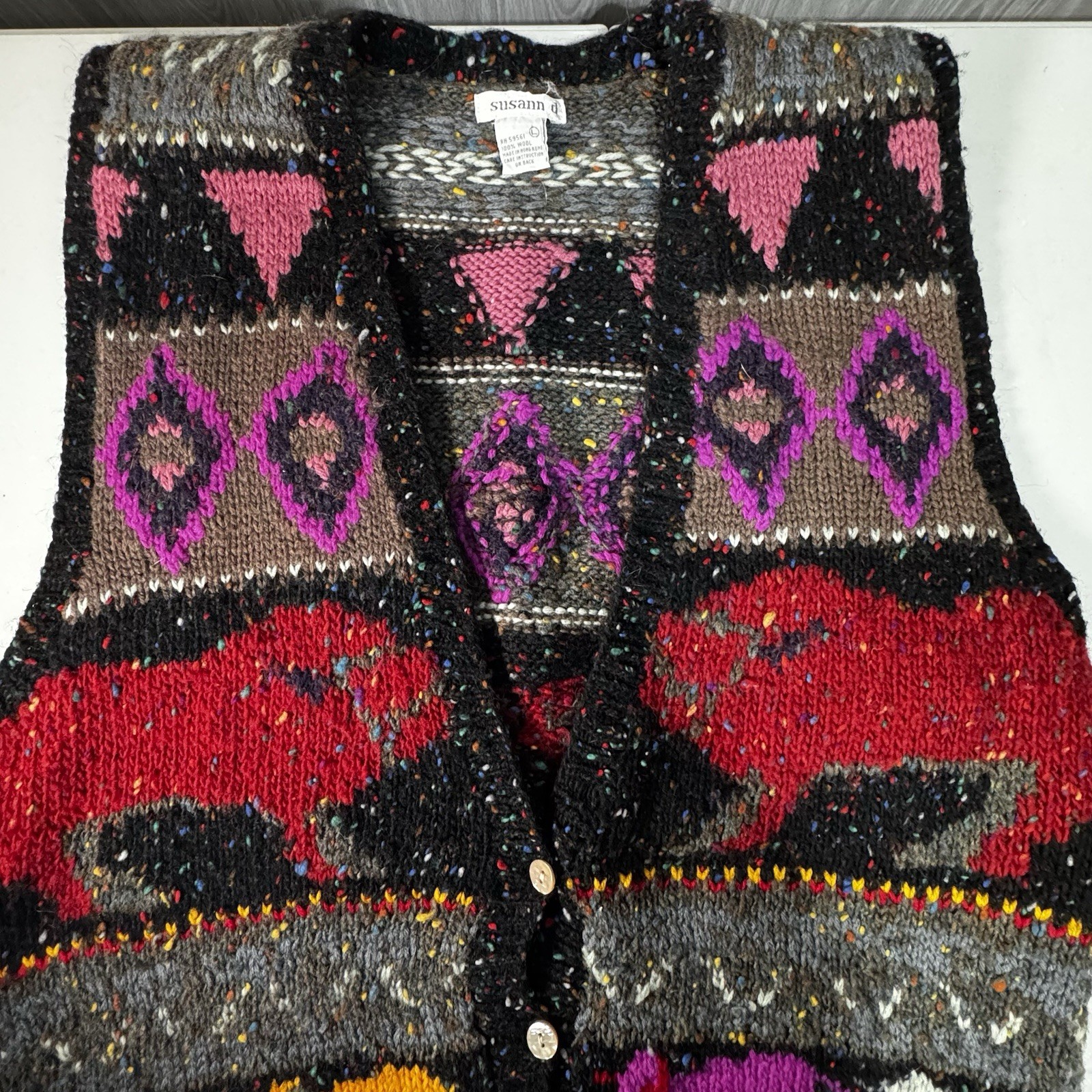 Vintage Susan D Wool Sweater Vest Colorful Animal Geometric Print Indie Sz L