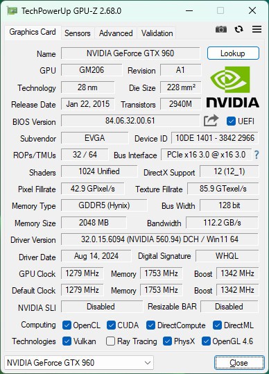 Chipset/GPU Model: NVIDIA GeForce GTX 960