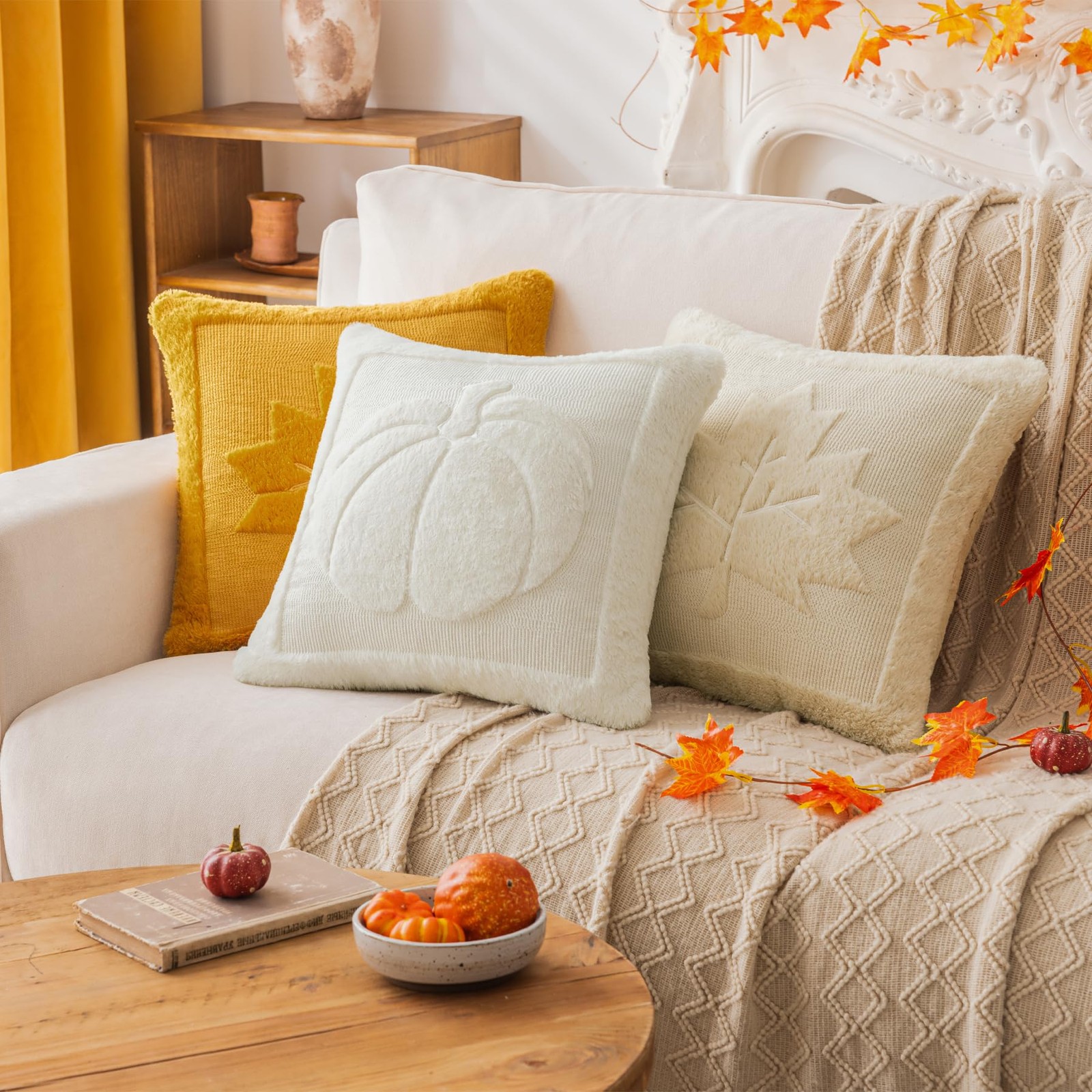 Cream White Pumpkin Fall Pillow Covers 20x20 Set of 2, Embroidered Faux Fur...