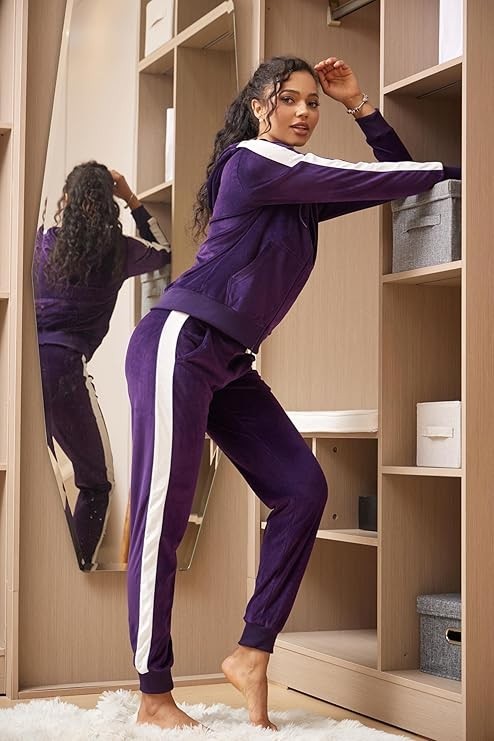 Women s Velvet Purple 2 Piece Tracksuit Full-zip With Hoodie Size XL