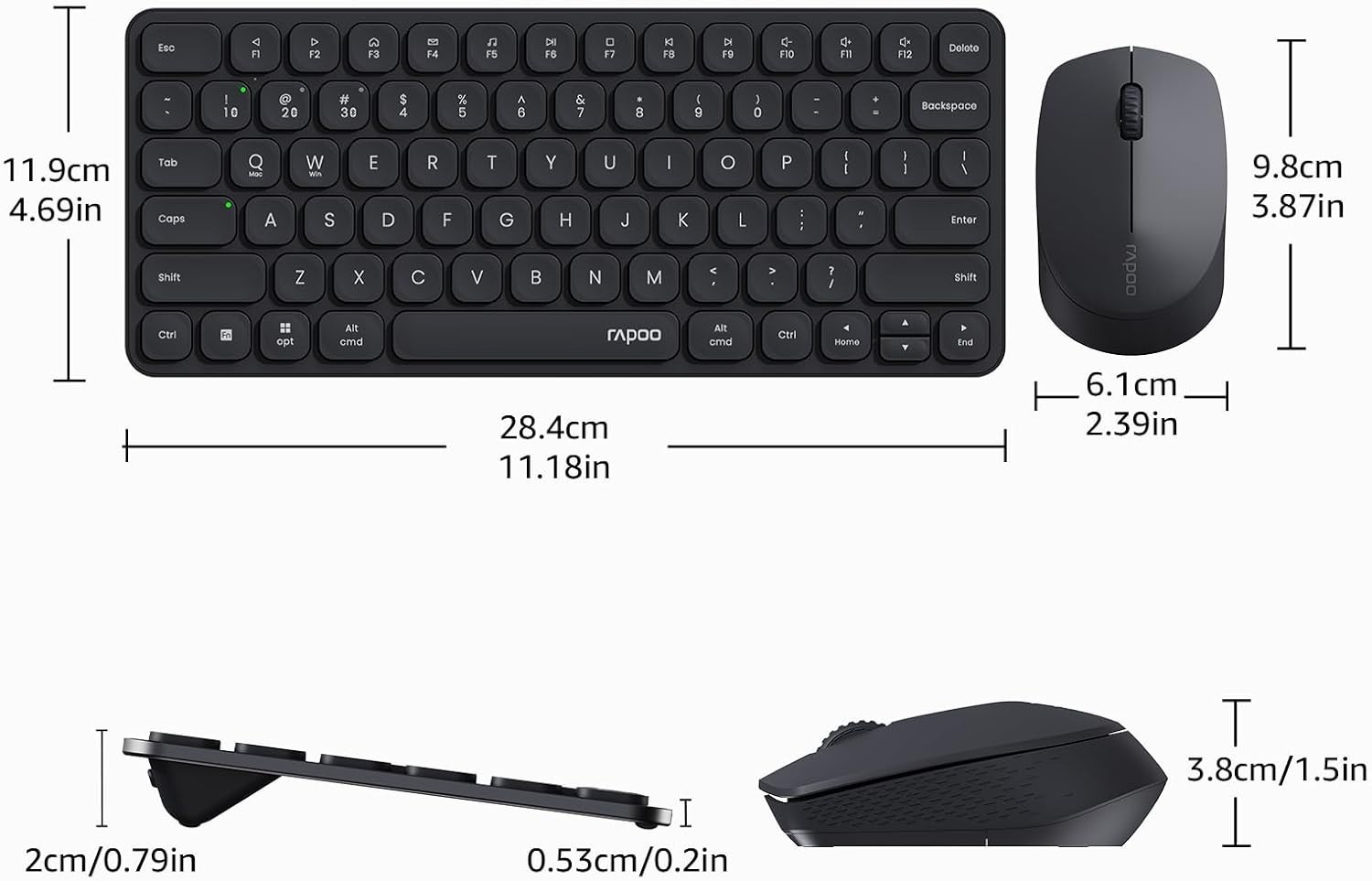 Особенности: Portable, Multi-Device Support, Driver-Free, Plug and Play, Wireless Connectivity, Low-Profile Keys, Silent Click, Adjustable DPI, Dual System Hotkey, Battery Indicator Lights, Device Indicator Lights