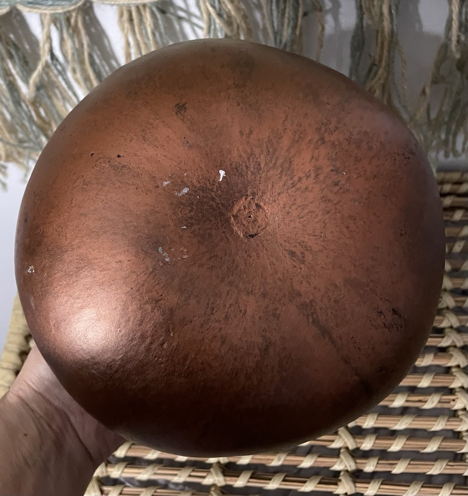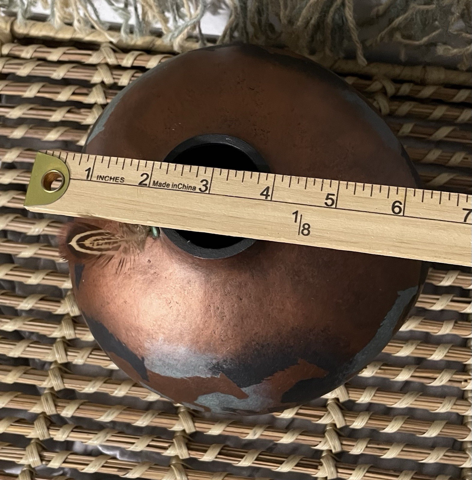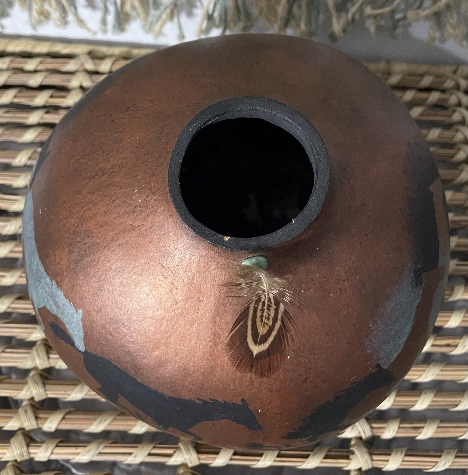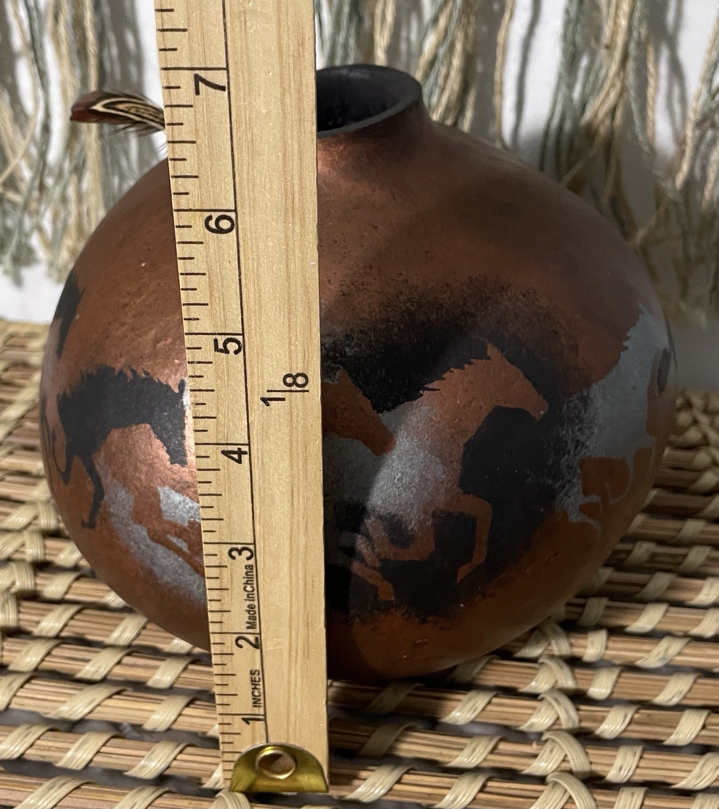 как выглядит Gourd Art Hand Painted Running Horses Vase Vessel Copper Silver Feather Accent фото