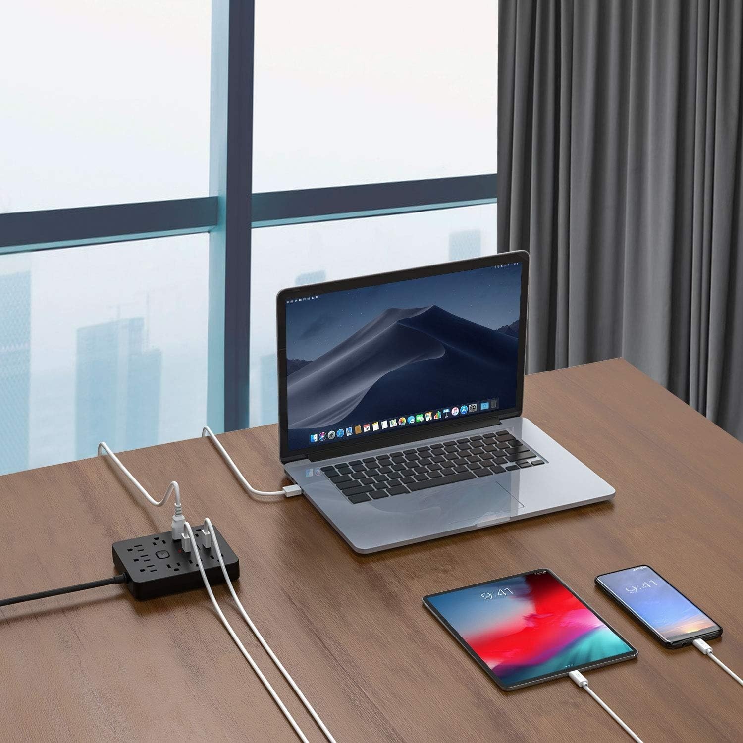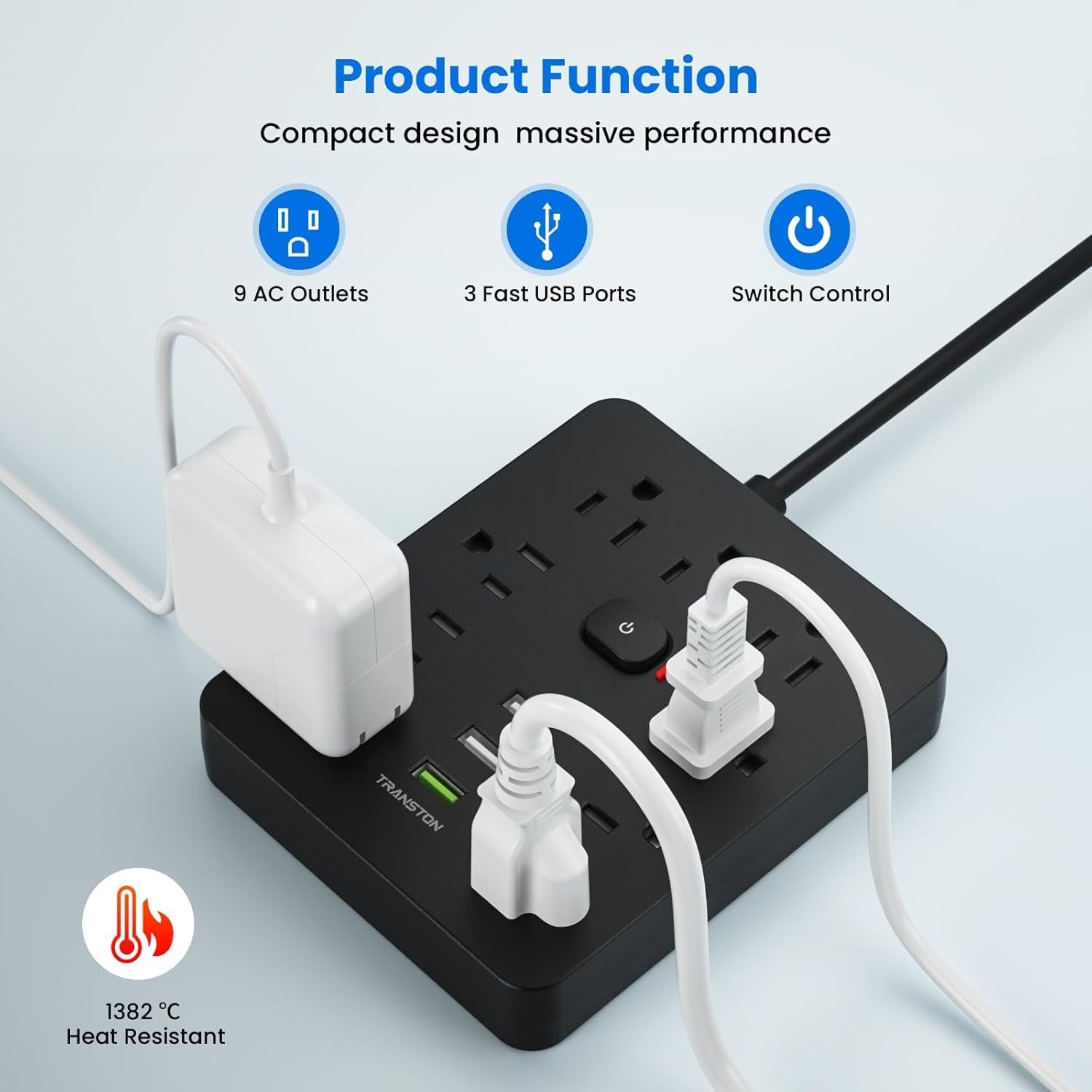 Surge Protector Power Strip 9 Outlets 3 USB Ports Flat Plug 5ft Extension Cord