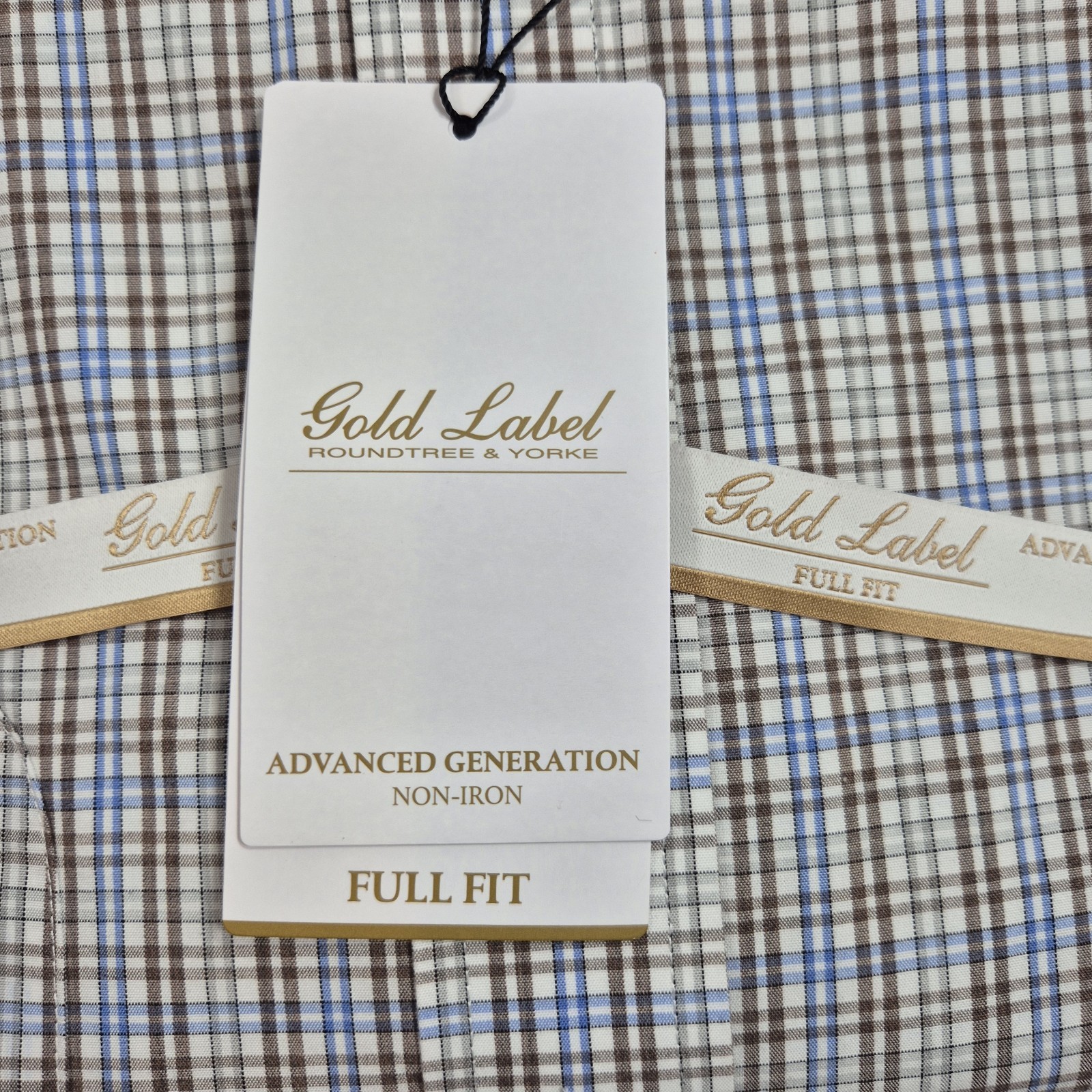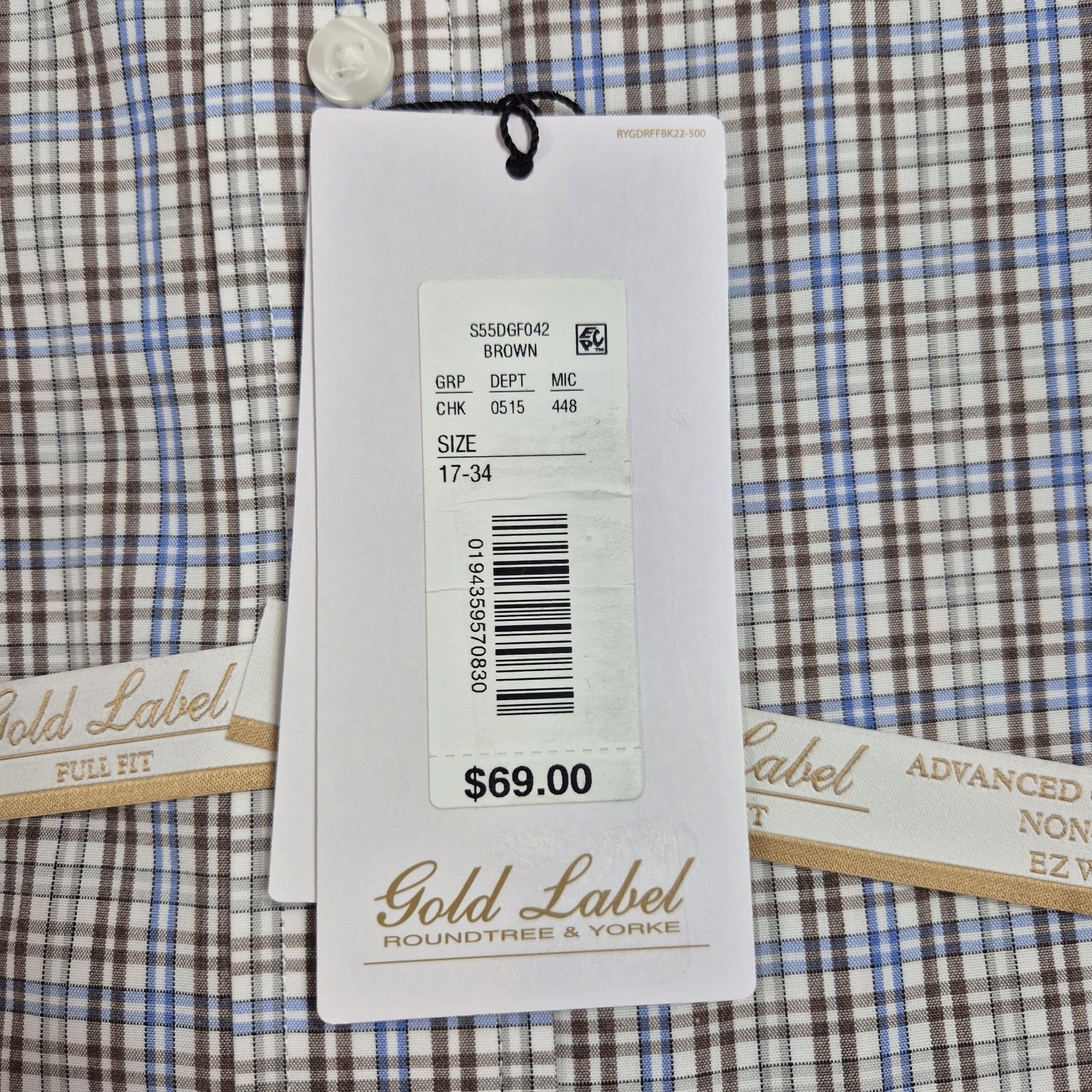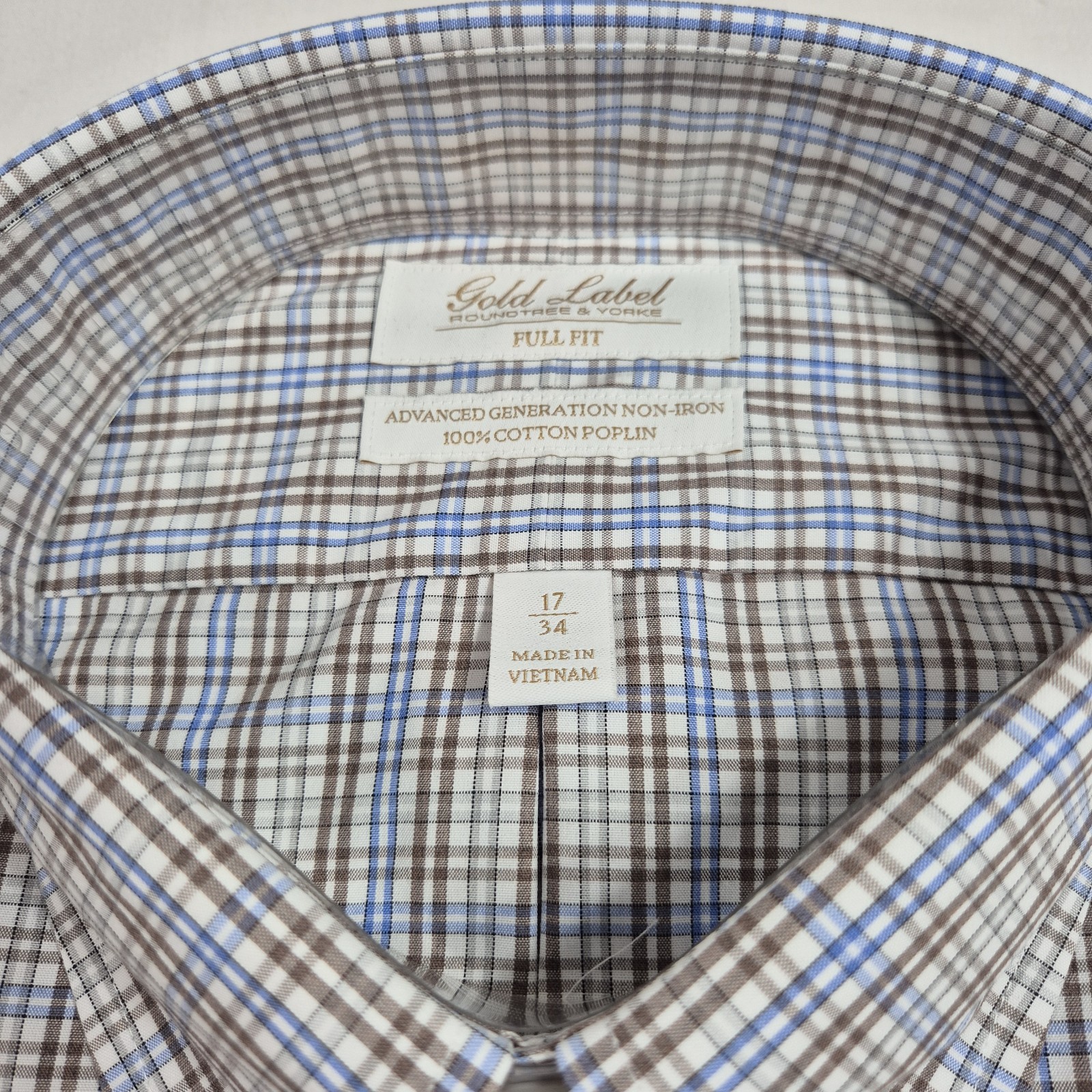 Roundtree Yorke Gold Label Men's Shirt Size 17 34 Brown Plaid Full fit Poplin 59