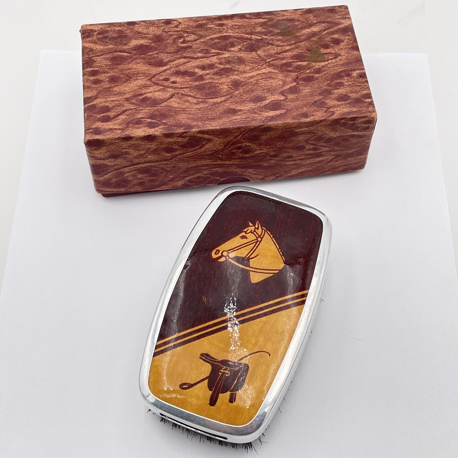 • Vintage Equestrian Chrome Bristle Clothes Brush Horse Head Saddle Graphic Box
