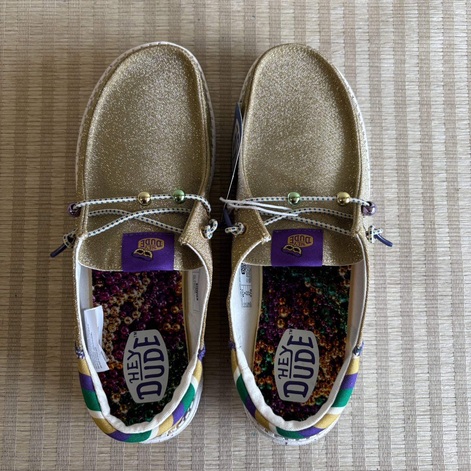 как выглядит Hey Dude Wendy Funk Mardi Gras LSU Shoes Womens Size 8 Gold Lightweight Loafers фото