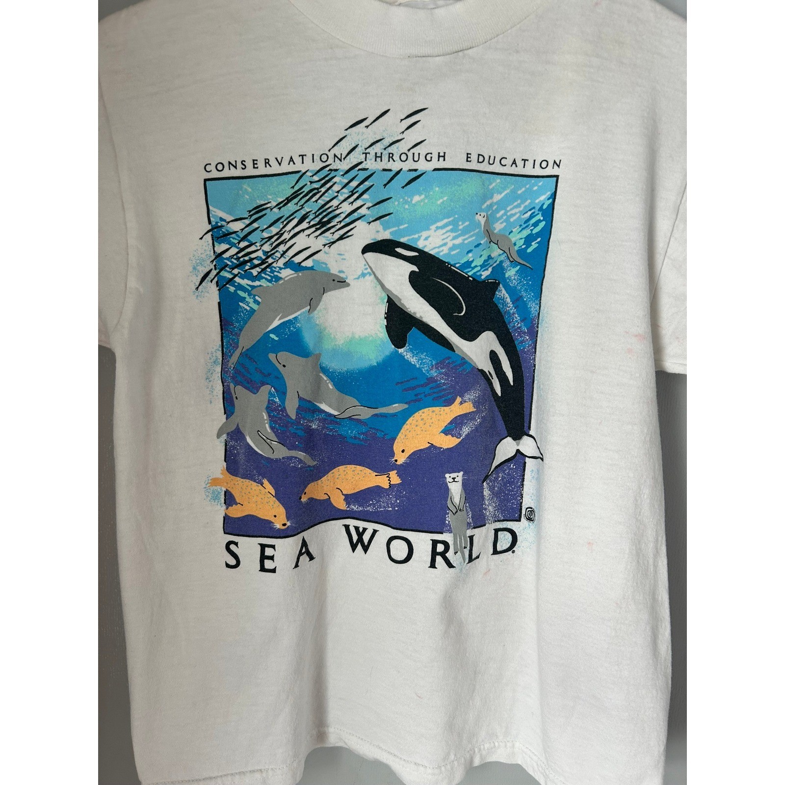 Vintage Kids Sea World Orca Dolphin Fish Graphic T Shirt Kids Size Medium M