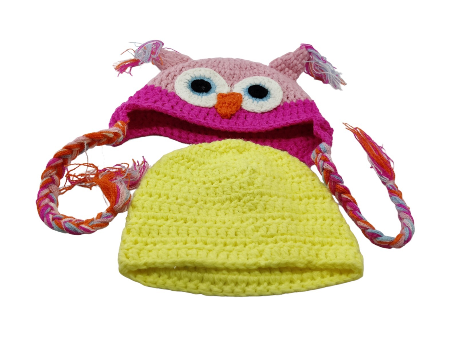 Crochet Hats Baby Girl Pink Owl Yellow Handmade 0-6 Months