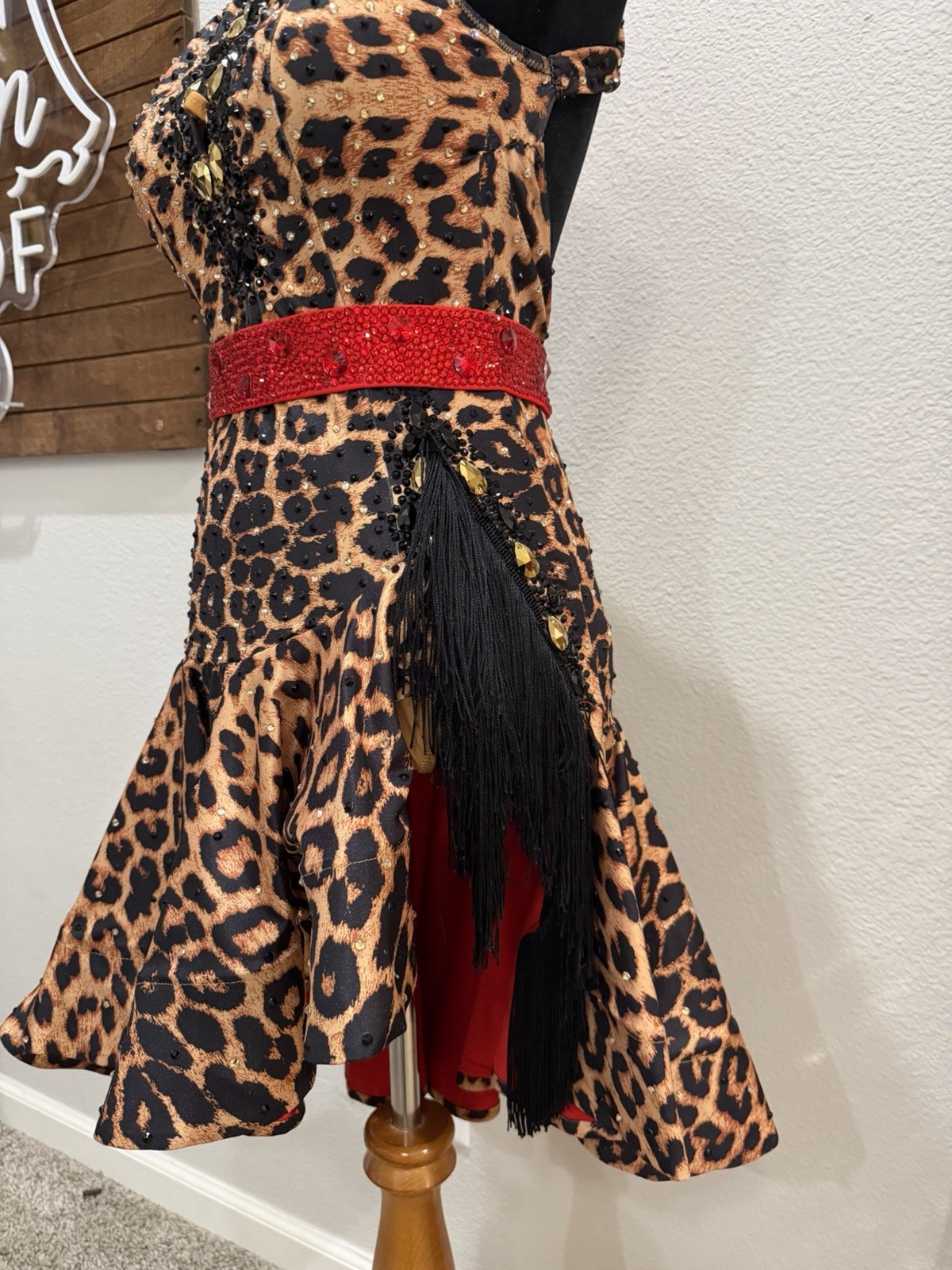 Leopard Animal Print Brown Black Red Accents Fringe Ballroom Latin Dance Dress