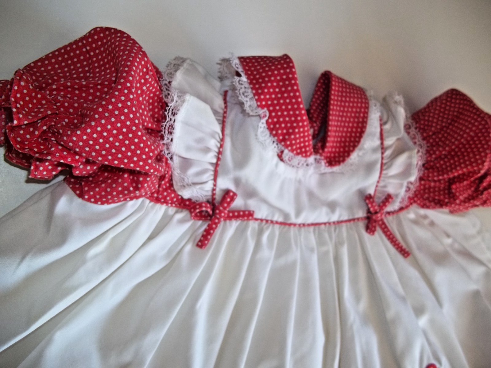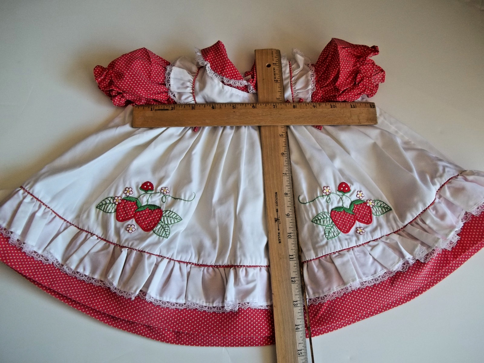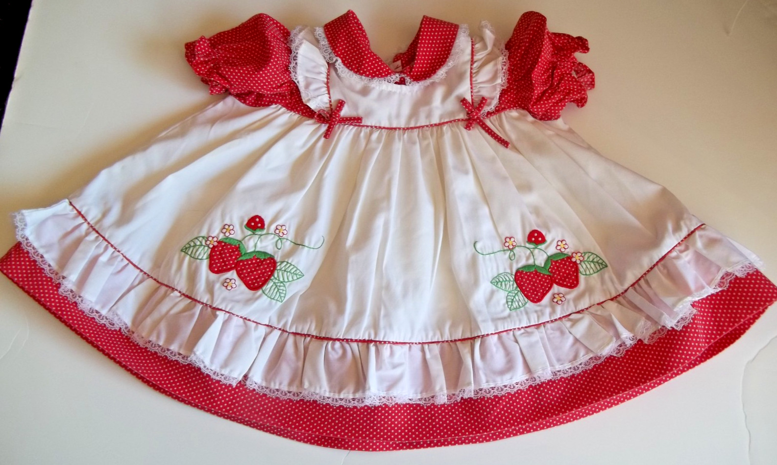 Vintage Girls 12 months Strawberry Applique Dress Ruffles Faux Pinafore 1970's