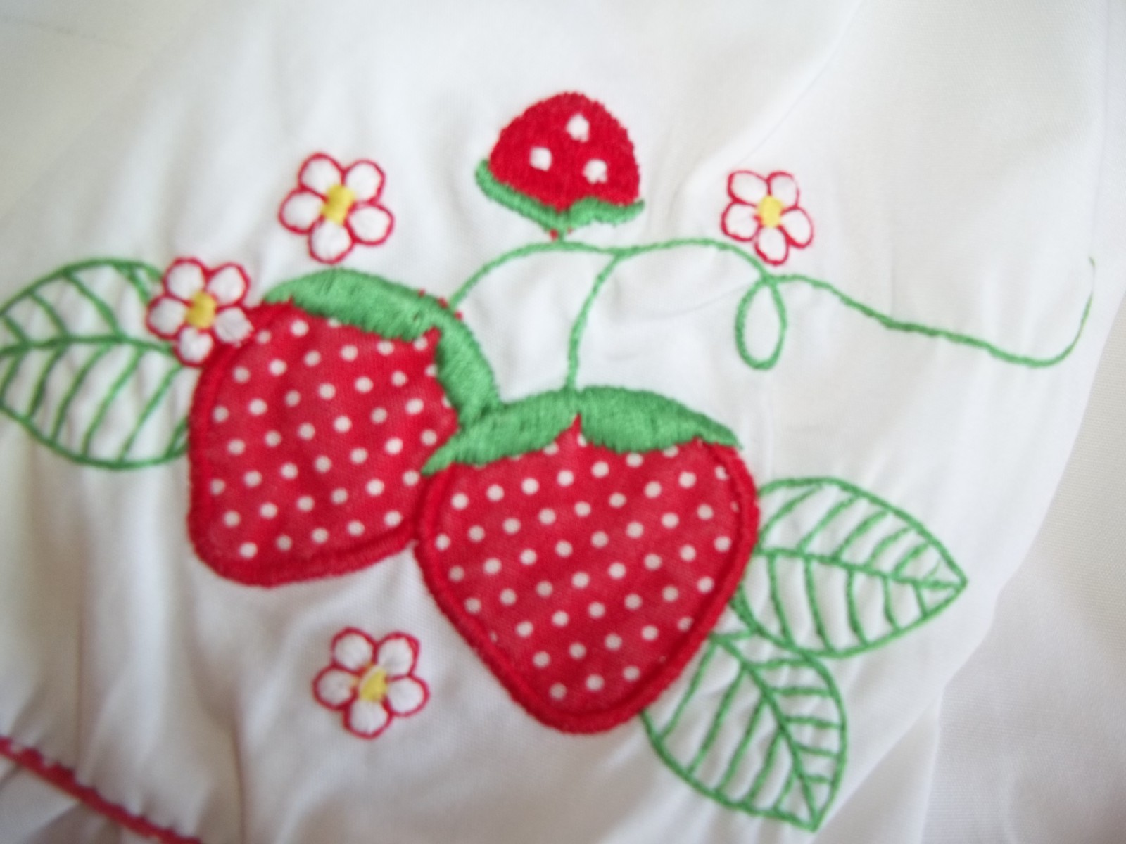 как выглядит Vintage Girls 12 months Strawberry Applique Dress Ruffles Faux Pinafore 1970