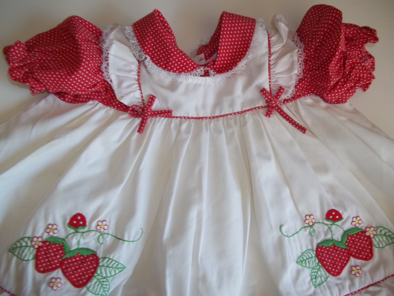 как выглядит Vintage Girls 12 months Strawberry Applique Dress Ruffles Faux Pinafore 1970s фото