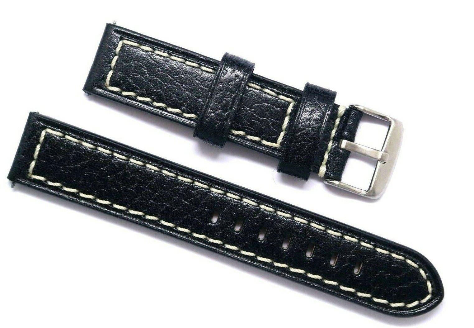 как выглядит 20mm Black Quality Oily Calf Leather Cut edge Mens Watch Band Silver Buckle фото