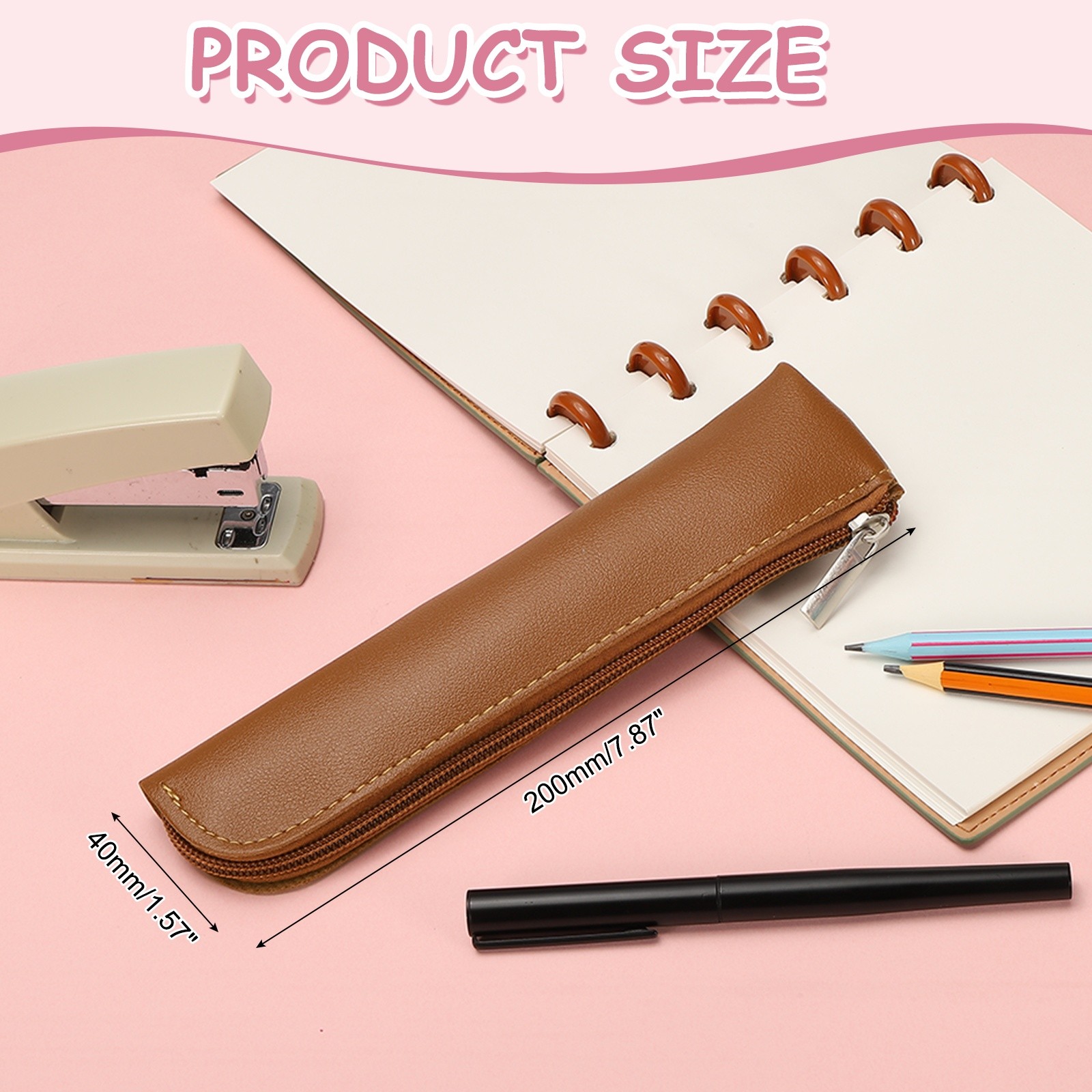 Mini Leather Pencil Stationery Make Up Bag with Zipper, Brown, 1 Pcs