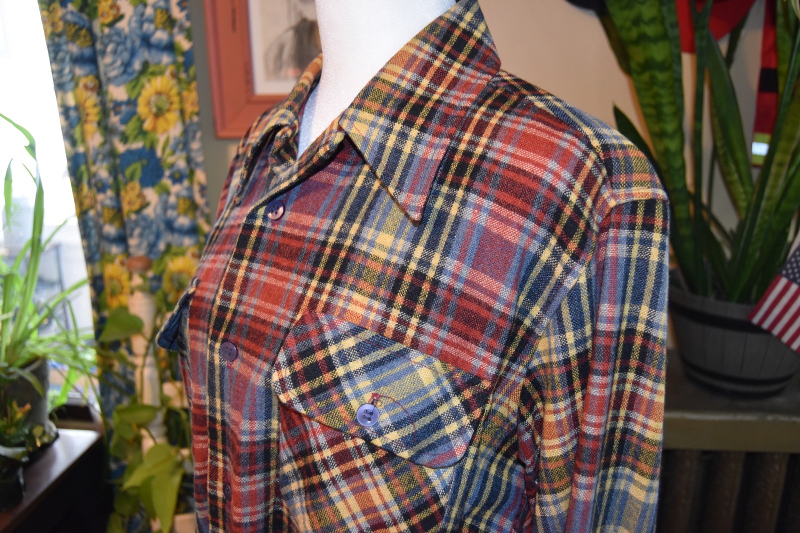 Vintage 60s Arrow Shacket Men Large Red Blue Plaid Wool Flannel Button-Up Medium