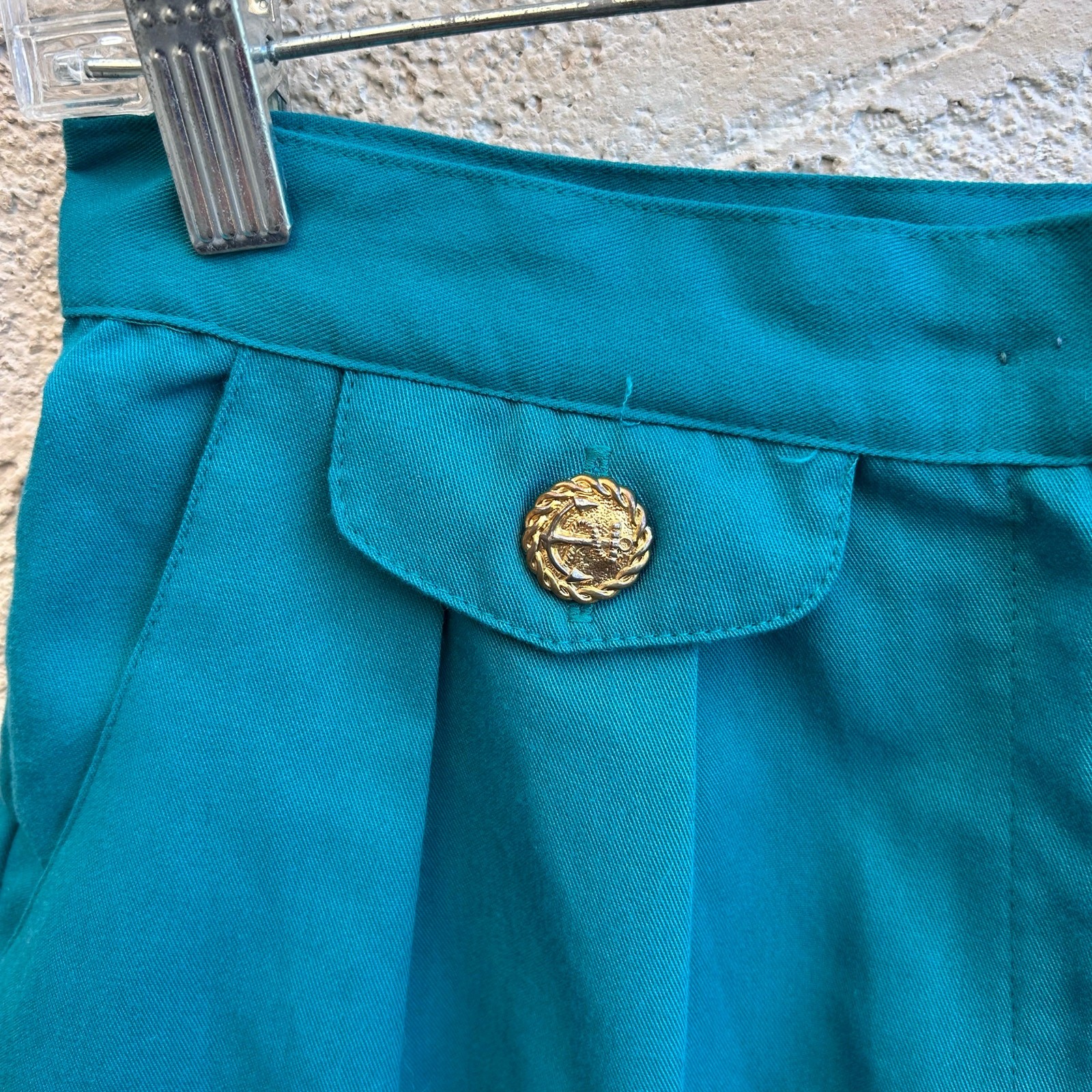 Vintage Teal High-Waisted Pleated Shorts Gold Button Detail Size 10