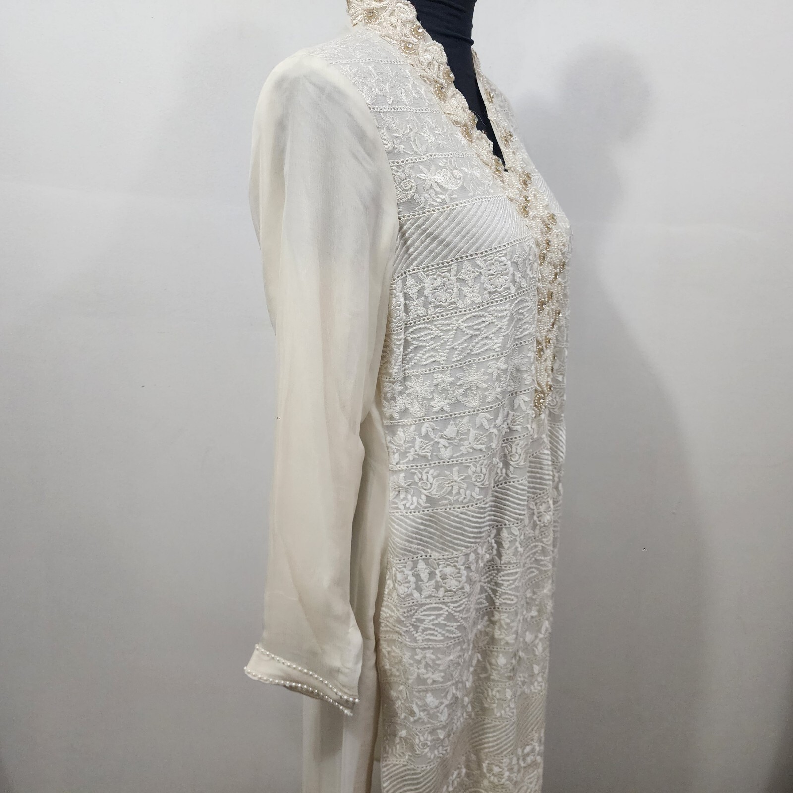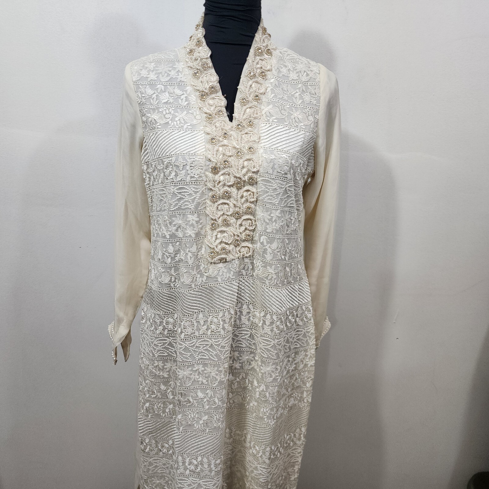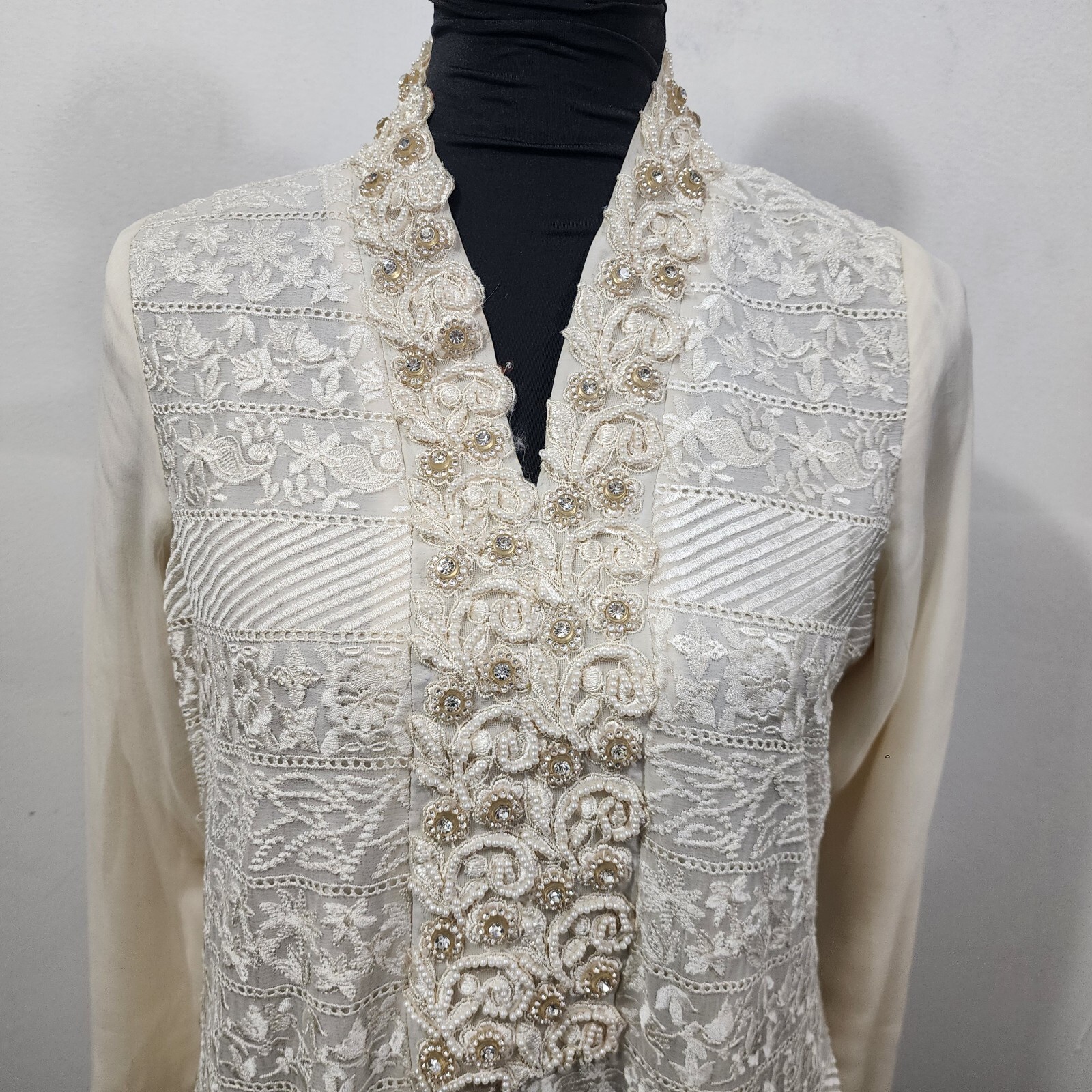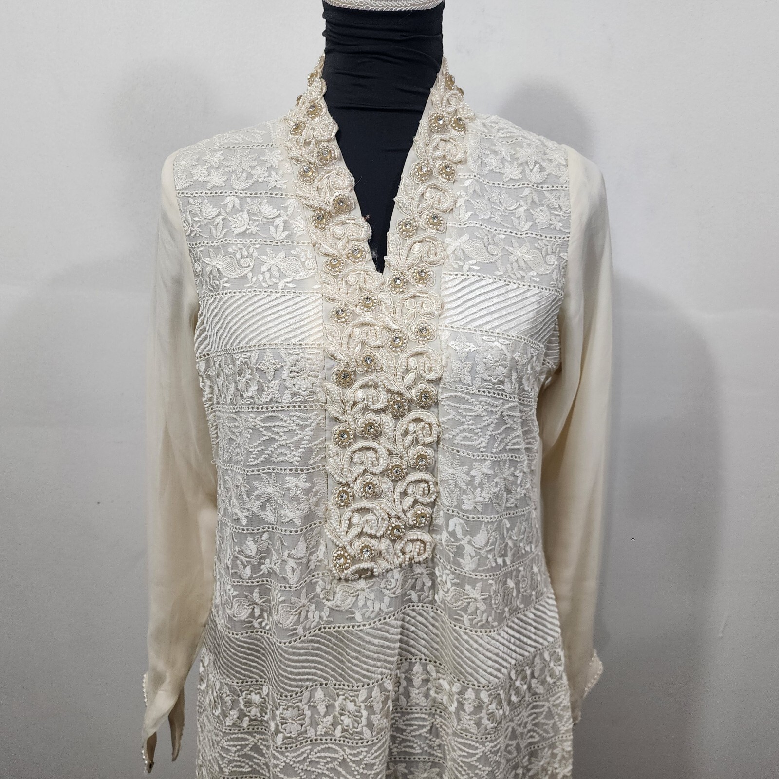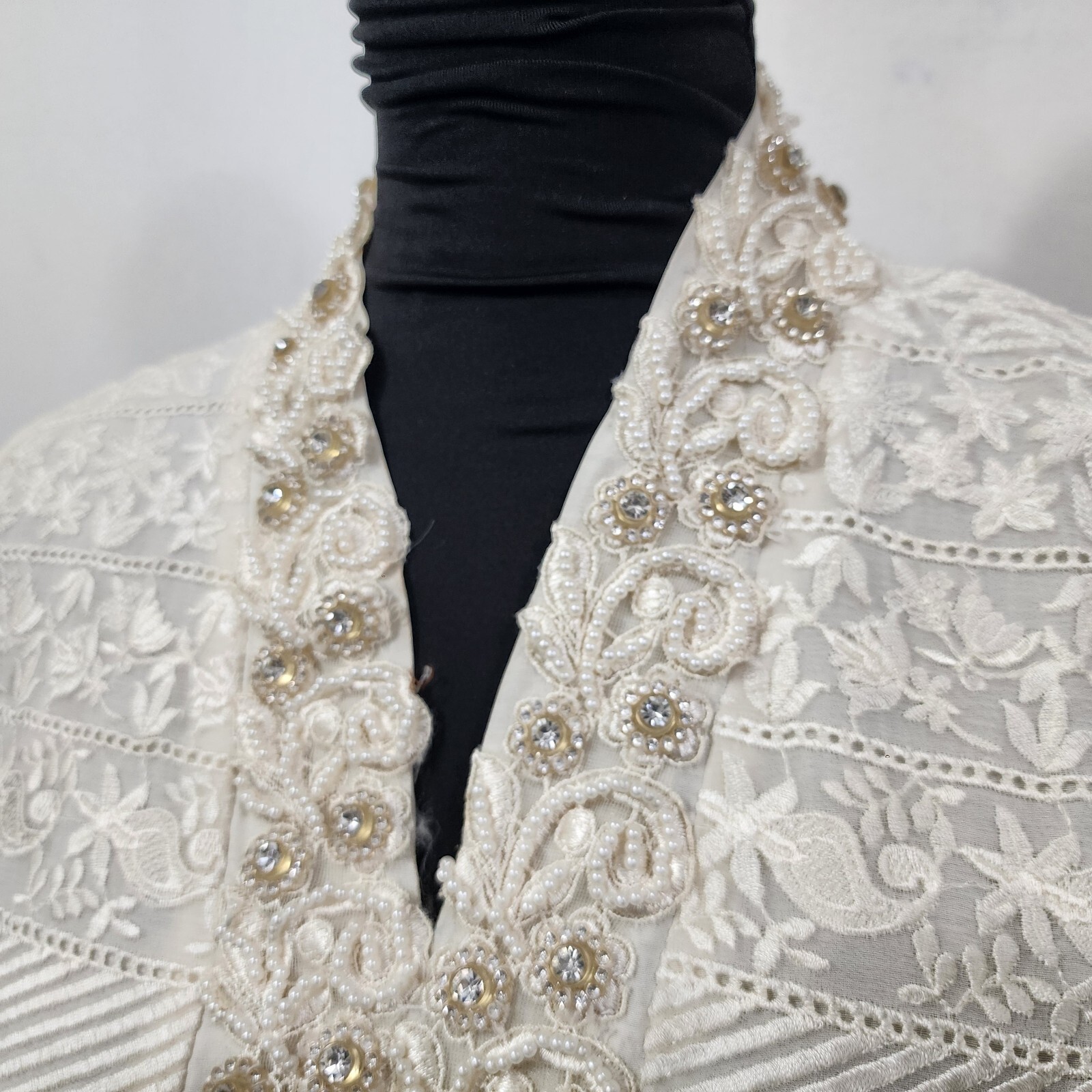 Cream Rhinestone Kurta Tunic Top 3/4 Sleeve Classic Traditional Women's Size S